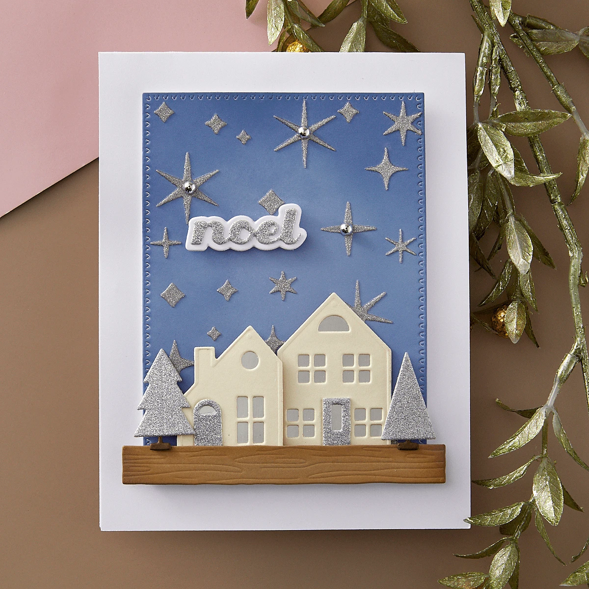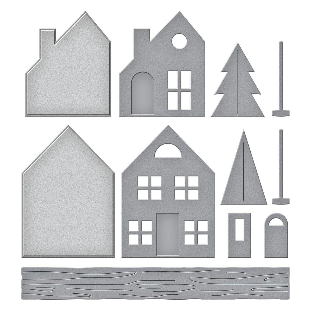 Mantel Village Etched Dies are from the Timeless Trees Collection by Simon Hurley. Create a sweet winter village on a wood mantel. The set of 10 thin metal cutting dies includes two house shapes, the matching insert dies with window and door details, two doors, two tree designs with their stands, and the wood mantel to complete the set. Works with S4-1398 Mantel Decorations to give the scene a festive look.