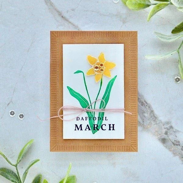 March Daffodil Press Plates are part of the Florals Through the Year Collection. The Daffodil symbolizes resilience which makes it perfect when transitioning from cold to warmer weather! The set of three plates includes the floral focal point, the birth flower month and flower name. The set of three plates includes the floral focal point, the birth flower month, and flower name. This lovely flower is ideal for celebrating March birthdays, but is versatile enough to be used in a myriad of ways! Create a field of flowers with several of the plates from this collection, or make this flower a focal point with a sentiment of your choice.