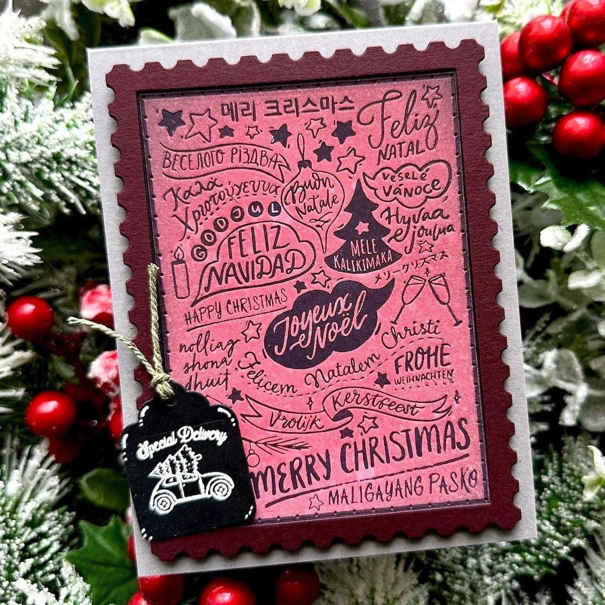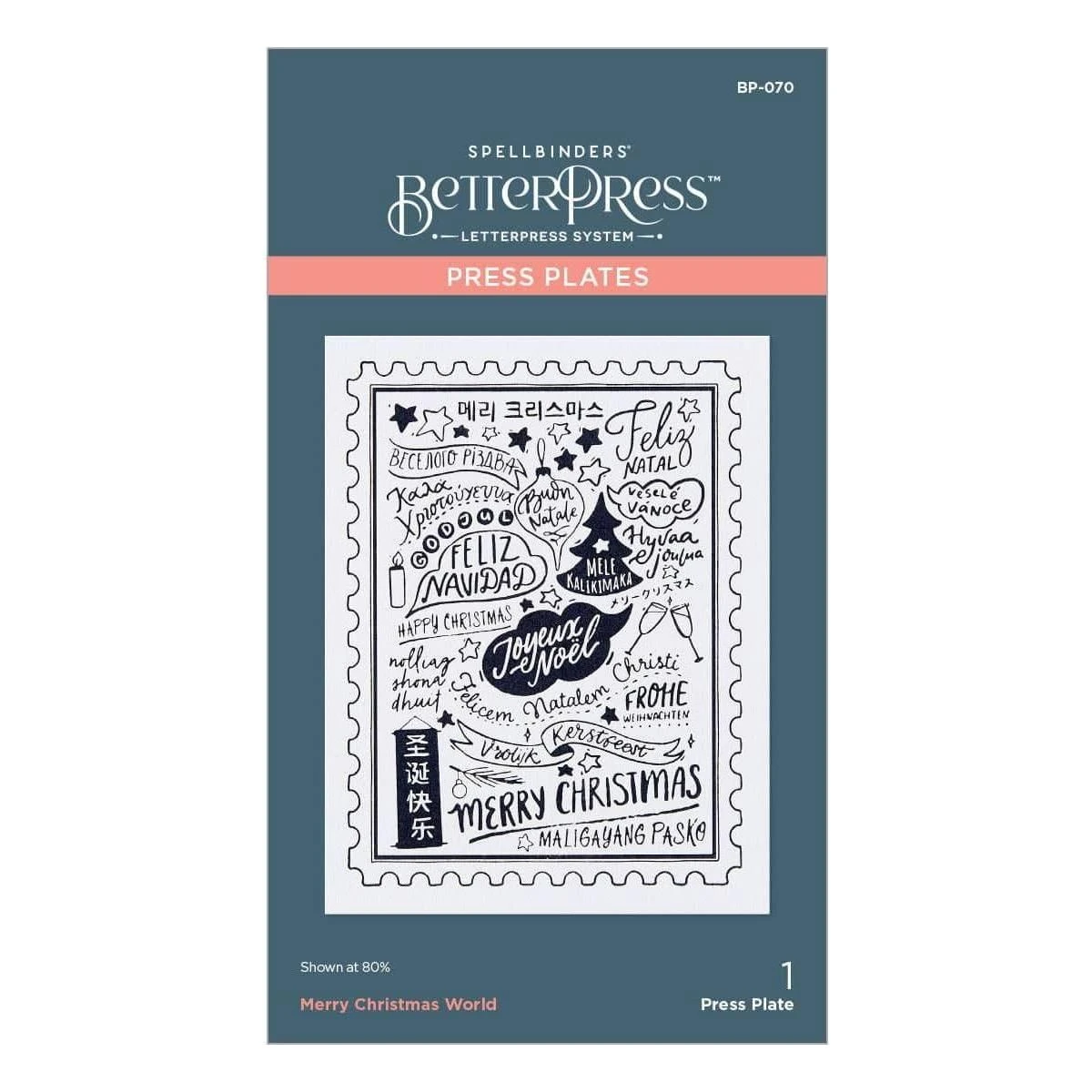 Merry Christmas World Press Plate is part of the BetterPress Christmas Collection by Spellbinders. The press plate is a postage shape filled with Christmas sentiments in different languages and holiday motifs. It’s designed to fit a standard A2 size card base. It’s a wonderful and unique pattern for someone looking for a different holiday design. Ink the plate with the BetterPress Ink to be pressed against the BetterPress Cotton Card Panel and Sheets to create a crisp letterpress design.