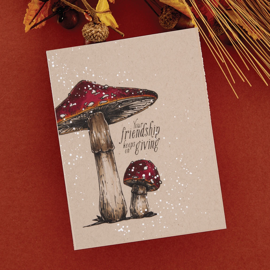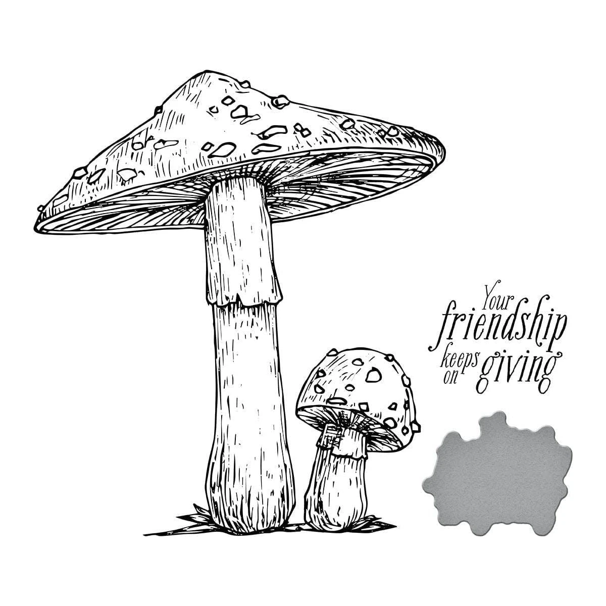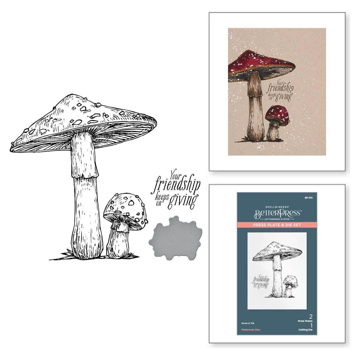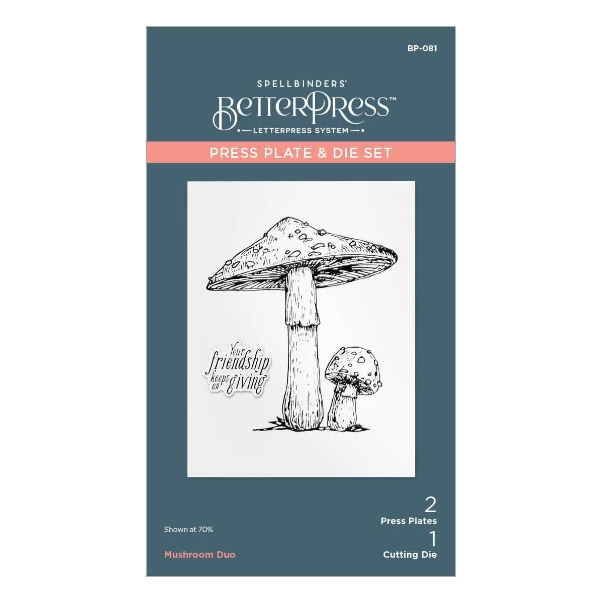 Mushroom Duo Press Plate & Die Set is from the BetterPress Autumn Collection. This sweet pair of mushrooms, along with the sentiment will sure bring a smile! Try this set of two press plates and one thin metal cutting die to send a friendly hello. Ink the plates with the BetterPress Ink to be pressed against the BetterPress Cotton Card Panel and Sheets for a crisp letterpress design.