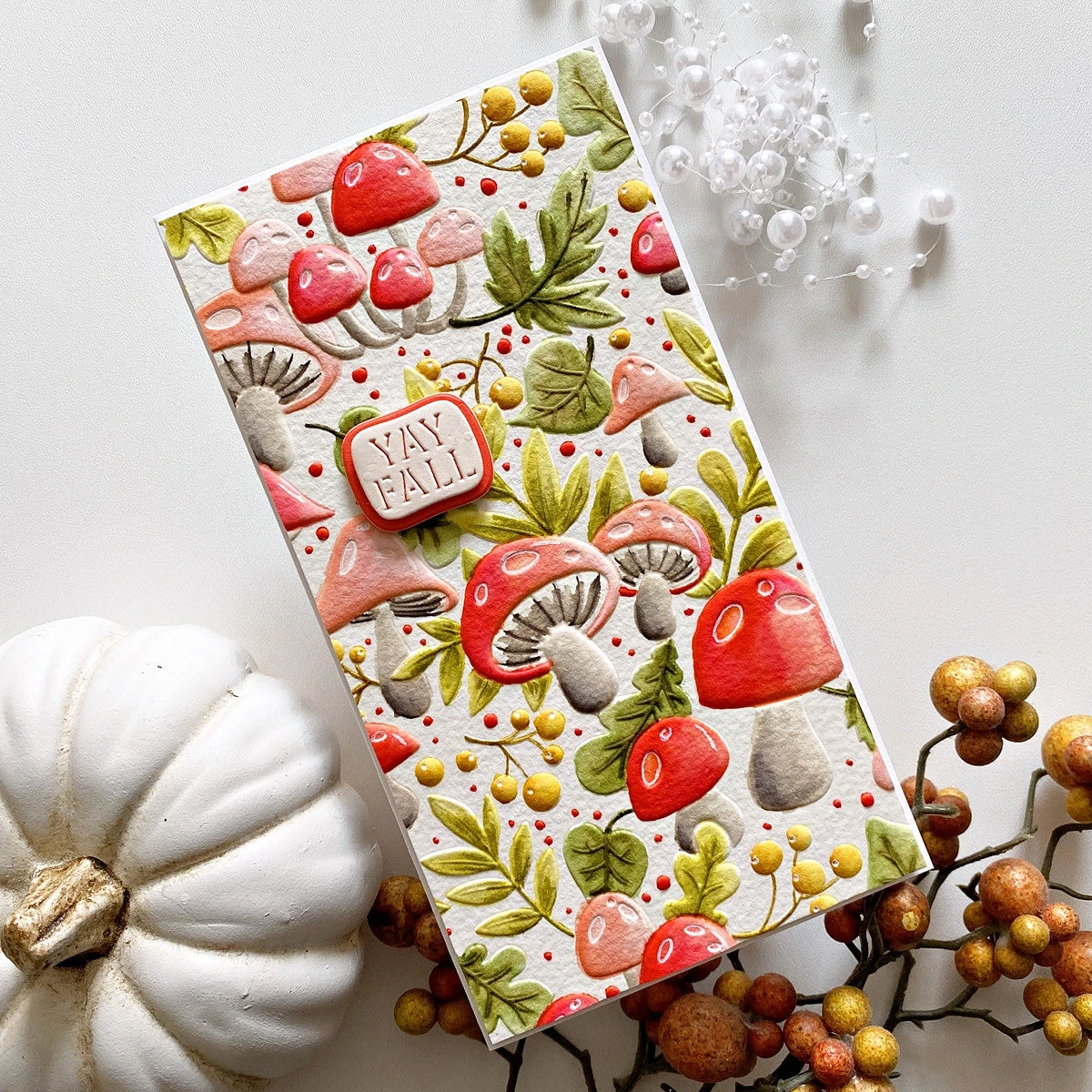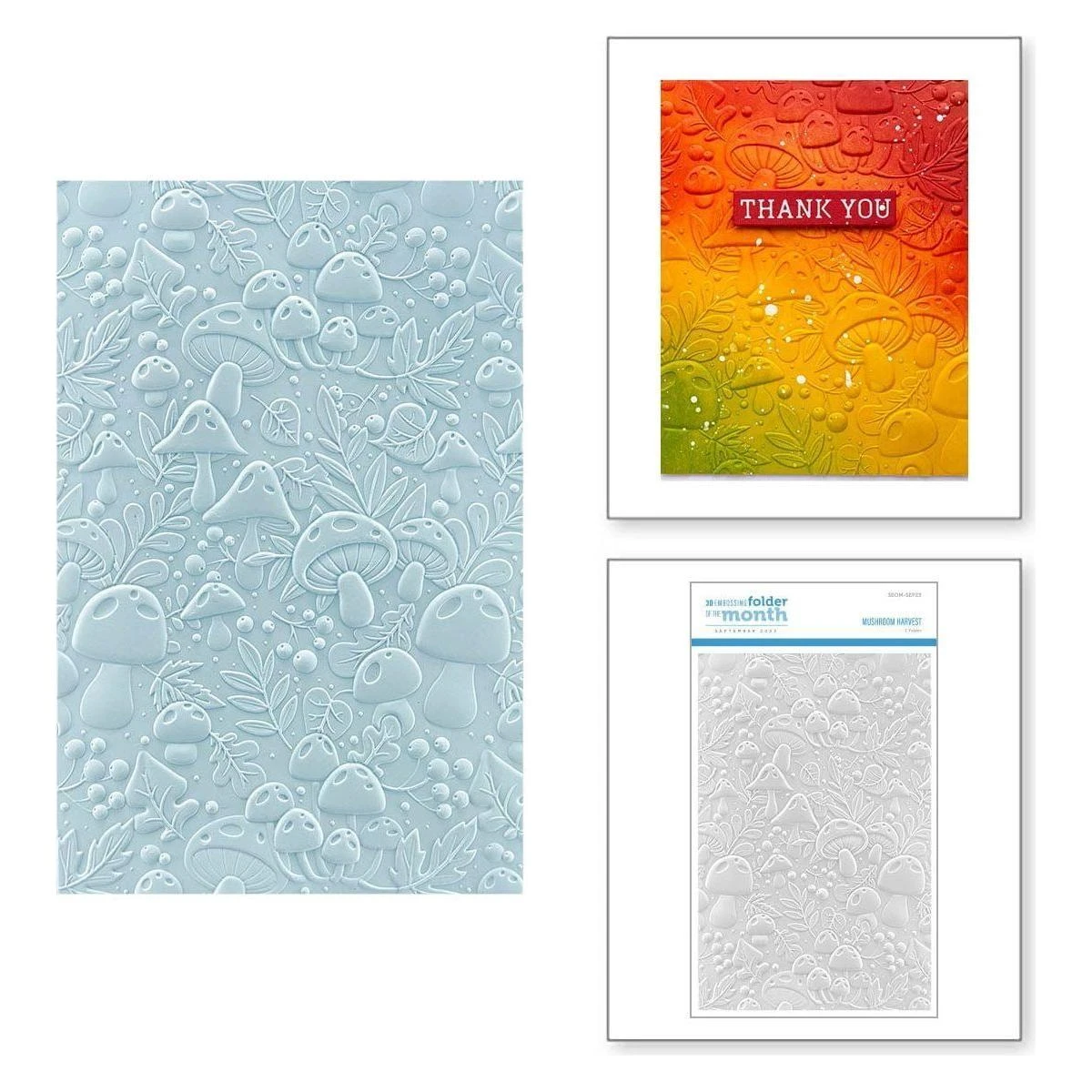Mushroom Harvest 3D Embossing Folder of the Month released September 2023 to our Embossing Folder of the Month Club. This large embossing folder can make slimline, 5″ x 7″, and a variety of sized projects. Perfect for adding even more texture and dimension to your card projects.