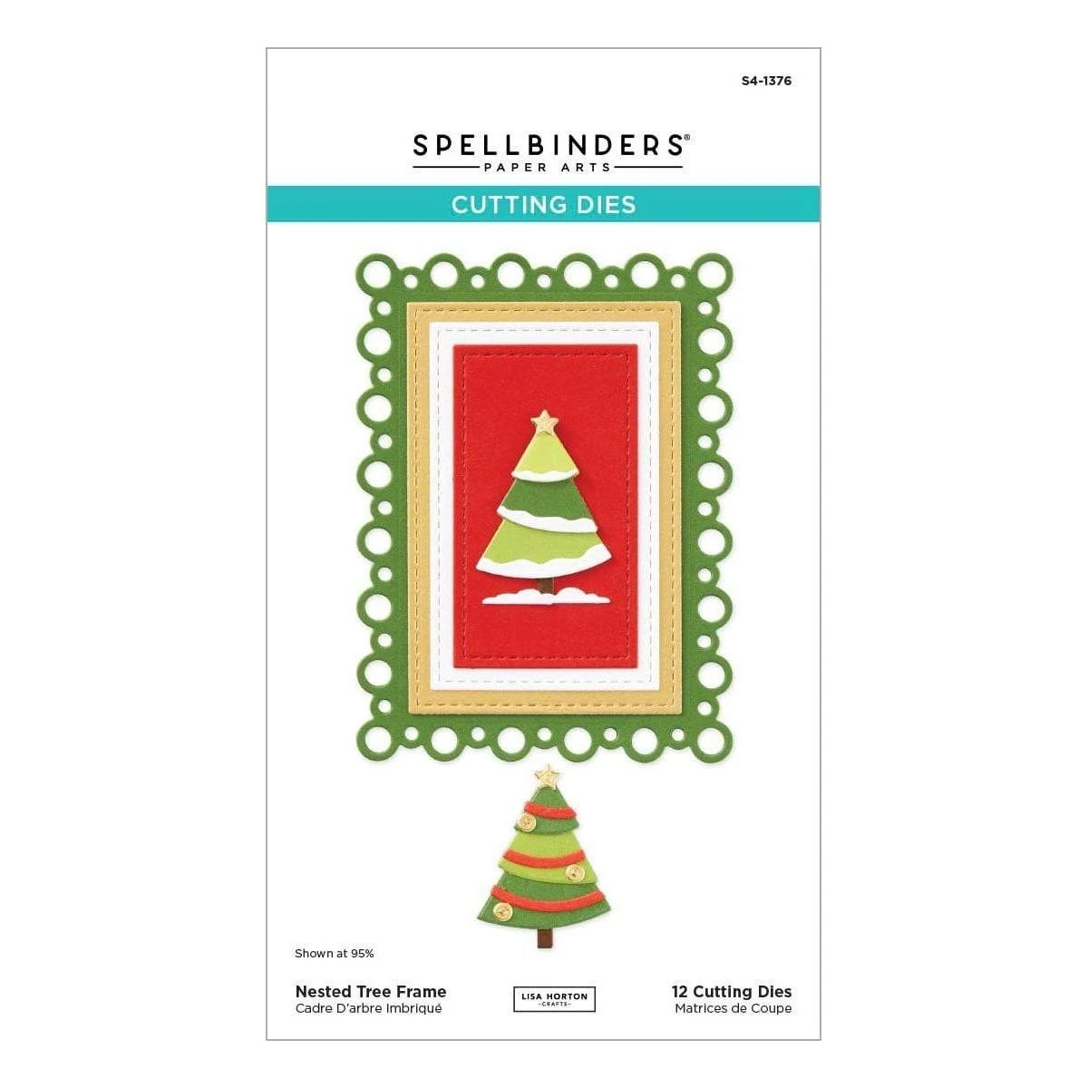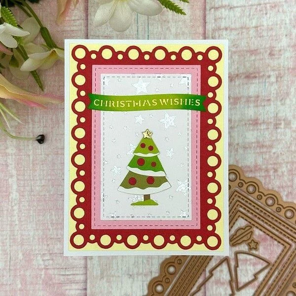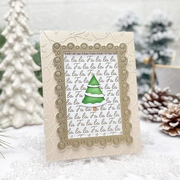 Nested Tree Frame Etched Dies is part of the Essential Holiday Collection by Lisa Horton. This set of 12 dies creates a wonderful nesting set of frames with a sweet layered pine tree in it’s center. The largest frame is outlined with a fun scalloped pattern of hollow circles. The other frames in the set are bordered with an embossed stitch effect for extra interest. The star of the show is the lovely many layered tree for the center, filled with lots of options for decorating the tree… the versatility Lisa’s products are known for!