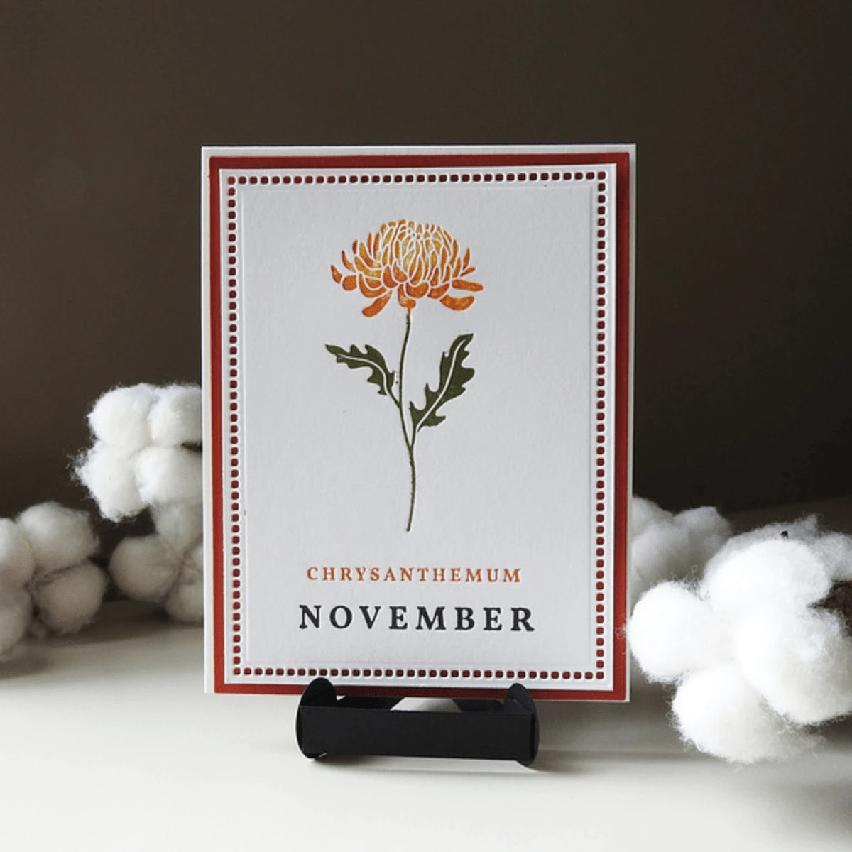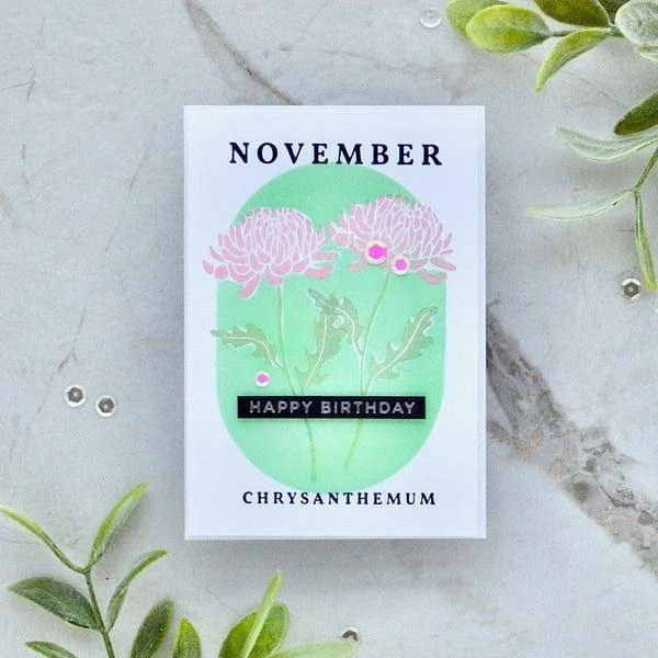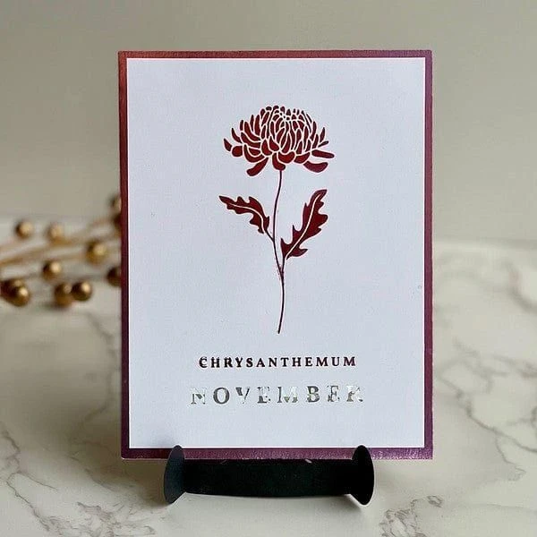 November Chrysanthemum Press Plates are part of the Florals Through the Year Collection. The November birth flower means friendship, honesty and loyalty. It’s believed that it will bring joy and good luck into your home. The set of three plates includes the floral focal point, the birth flower month, and flower name. This lovely flower is ideal for celebrating November birthdays, but is versatile enough to be used in a myriad of ways! Create a field of flowers with several of the plates from this collection, or make this flower a focal point with a sentiment of your choice.