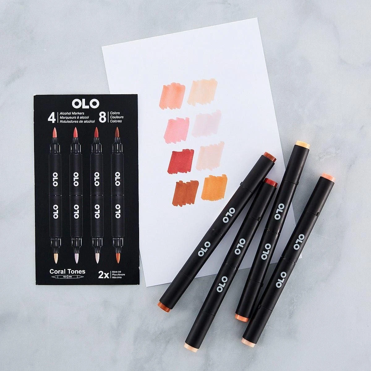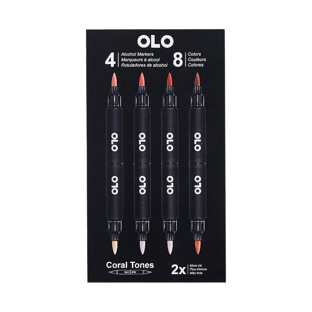 OLO Coral Tones Alcohol Markers Set – 8 Colors 4pc. includes eight colored half-markers that twist together to form four markers.