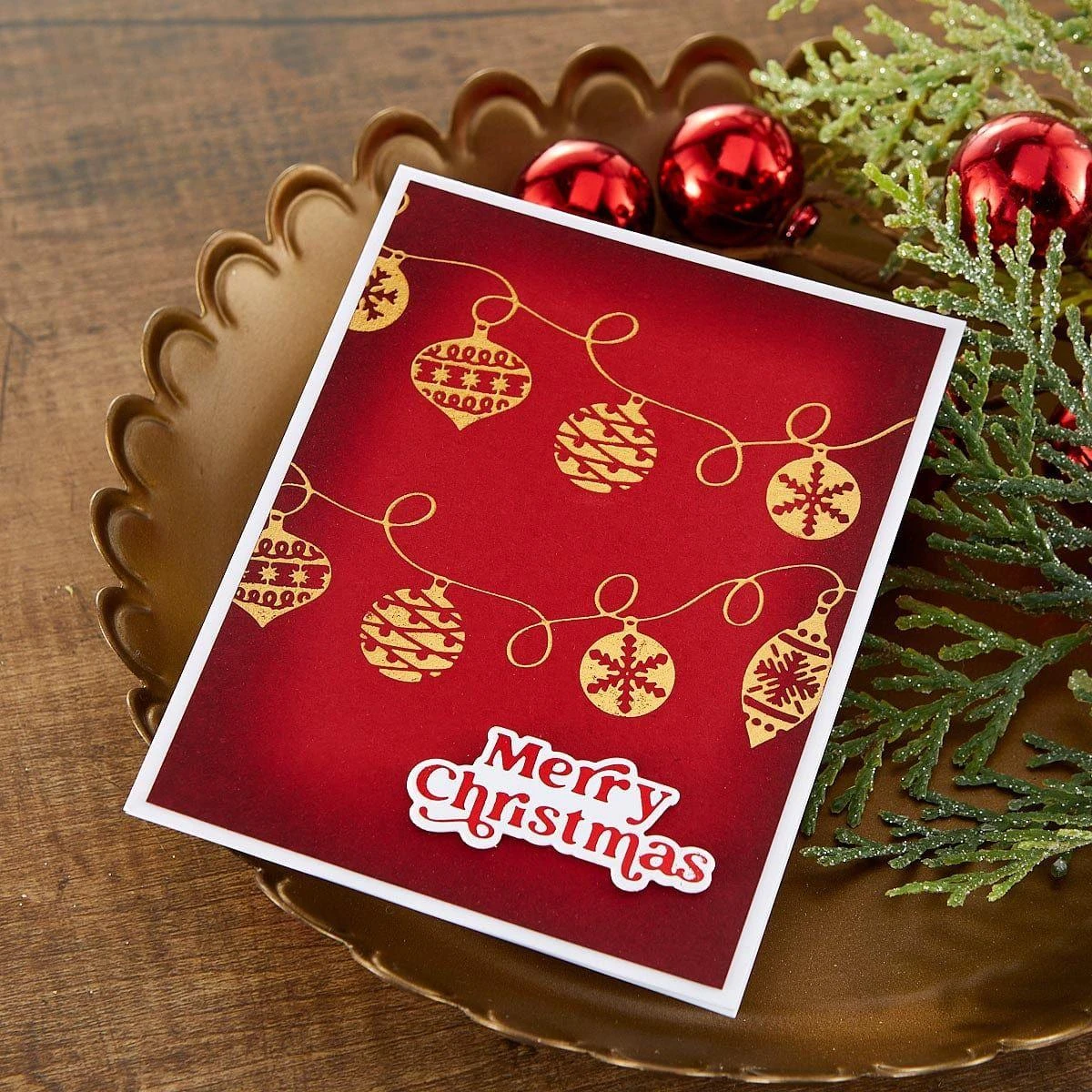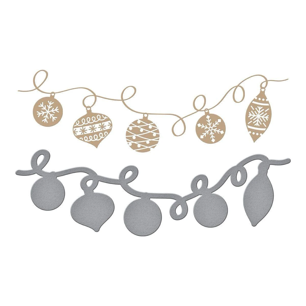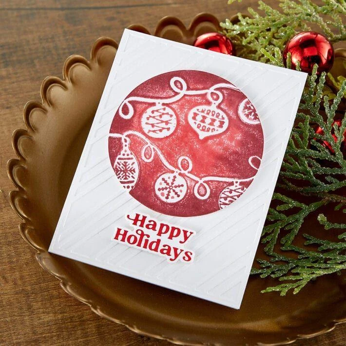 The Ornament String Glimmer Hot Foil Plate & Die Set is part of the Joyful Christmas Collection by Simon Hurley. On one hot foil plate, a garland of five holiday ornaments can be foiled all at once. Using its matching die, die-cut the shape with ease. This adorable holiday accent is perfect for your seasonal card creations!