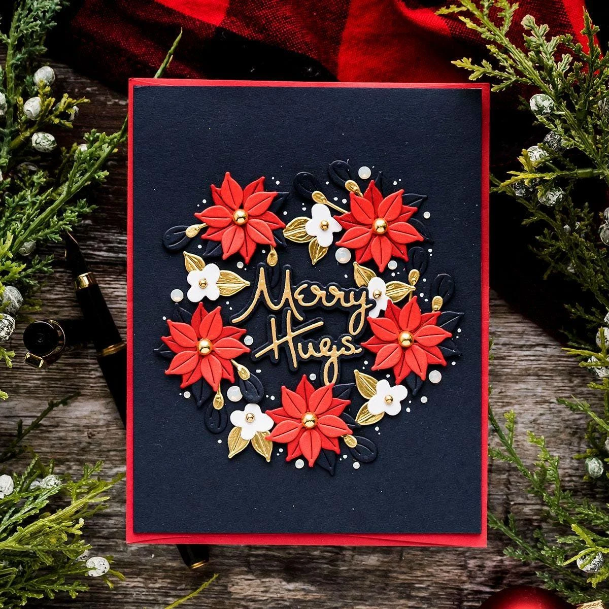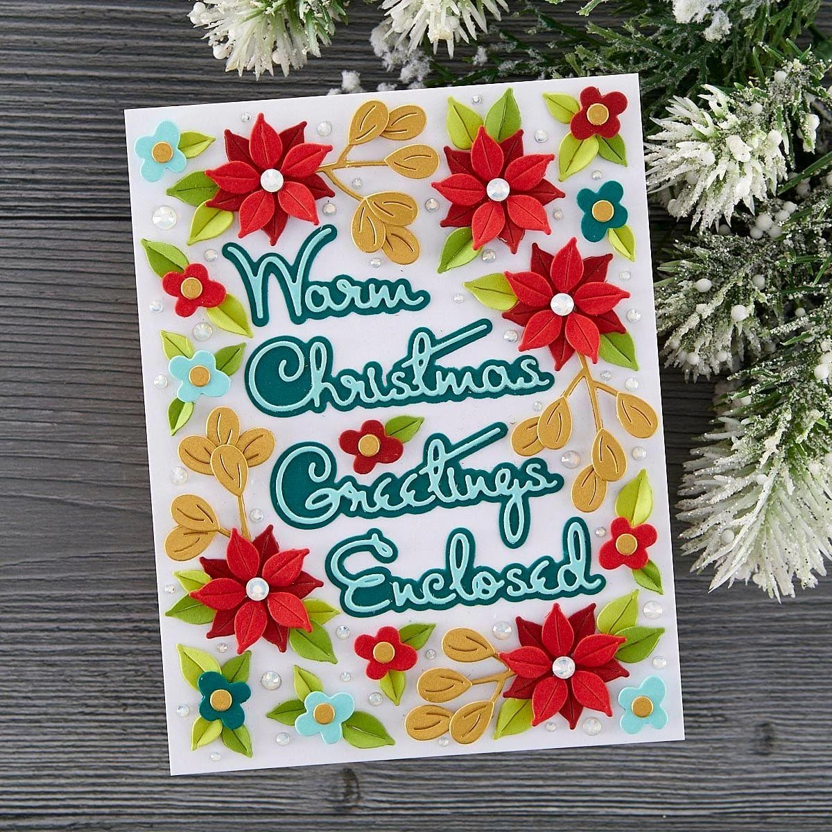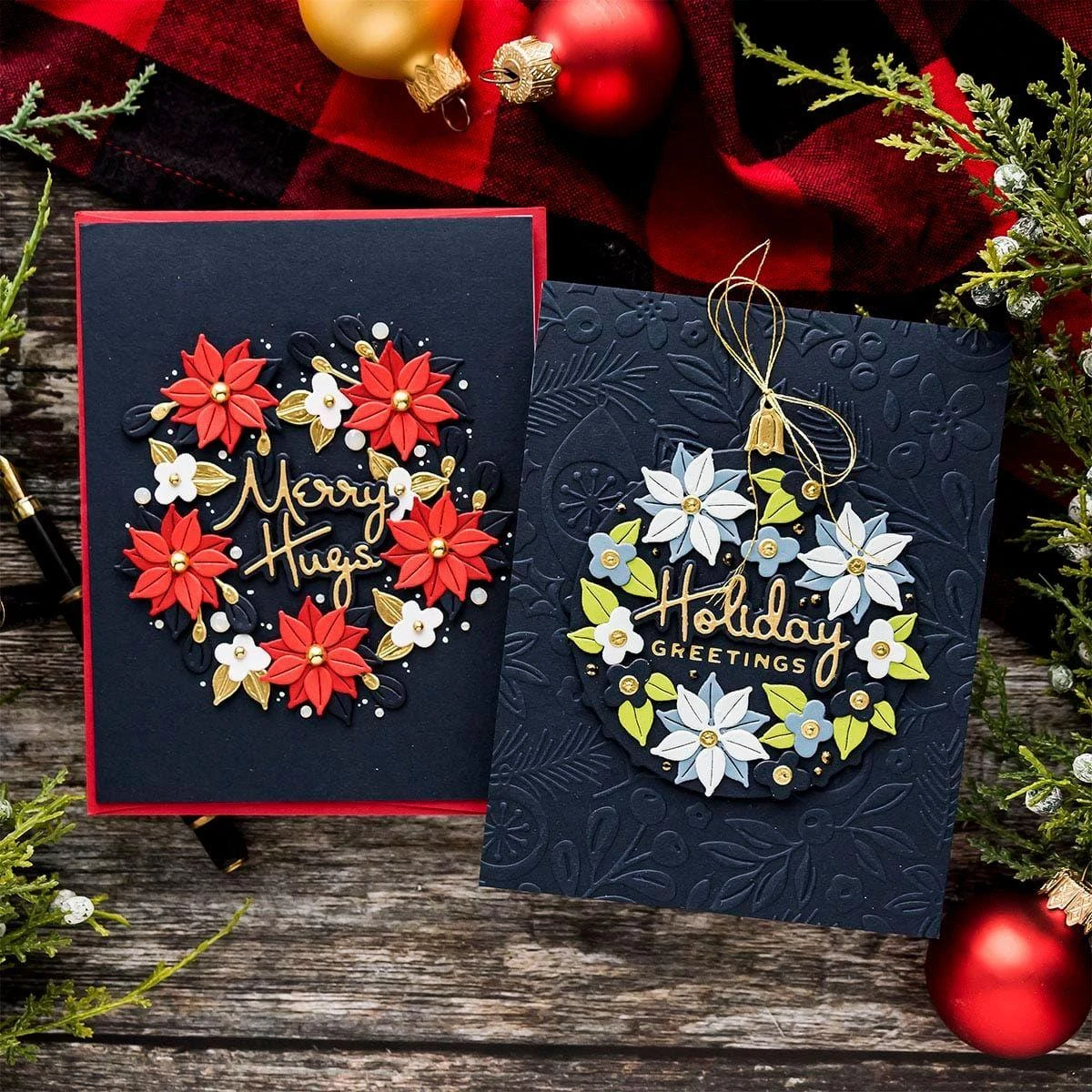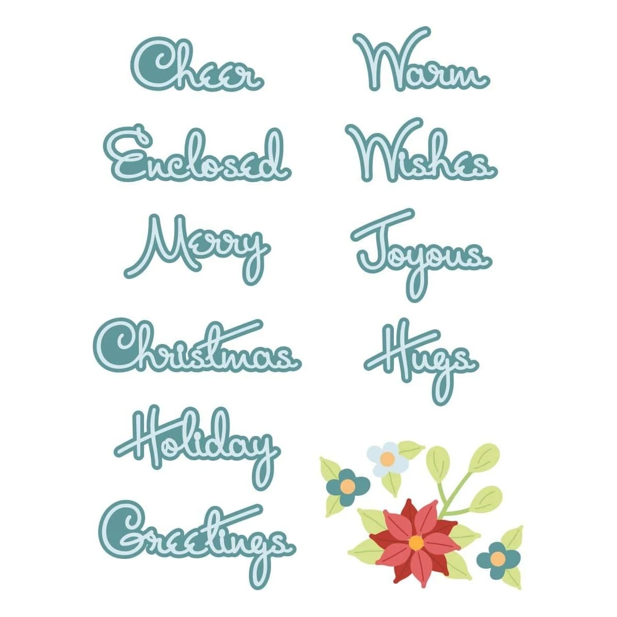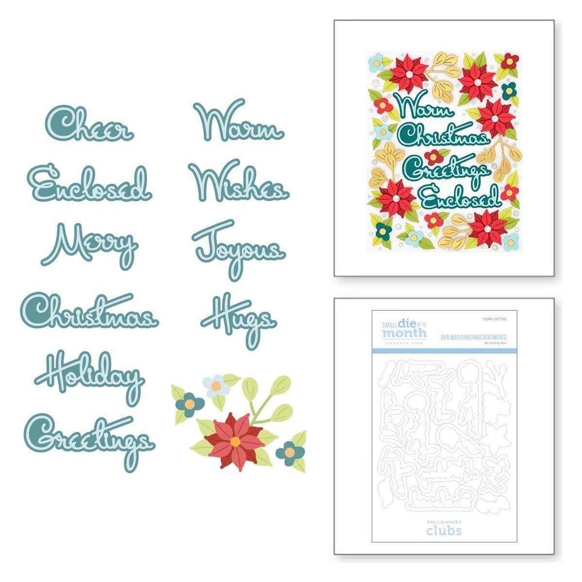 Outlined Christmas Sentiments – Small Die of the Month Club October 2022: die set, cuts, embosses, debosses, and stencils. This very popular holiday sentiment set includes a mini poinsettia perfect for crafting Christmas Cards. Use to create greeting cards, projects, gifts, and more!