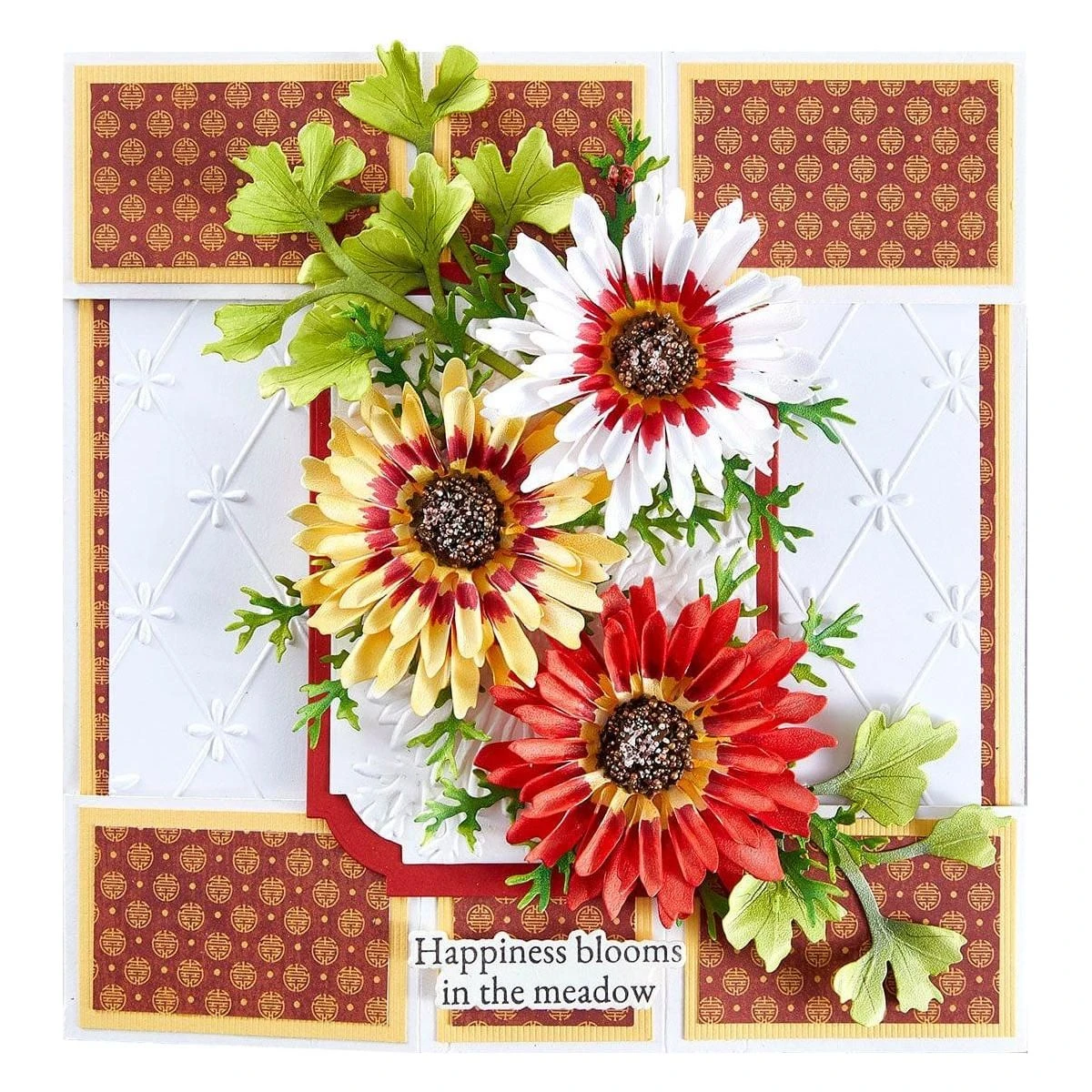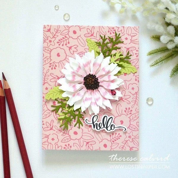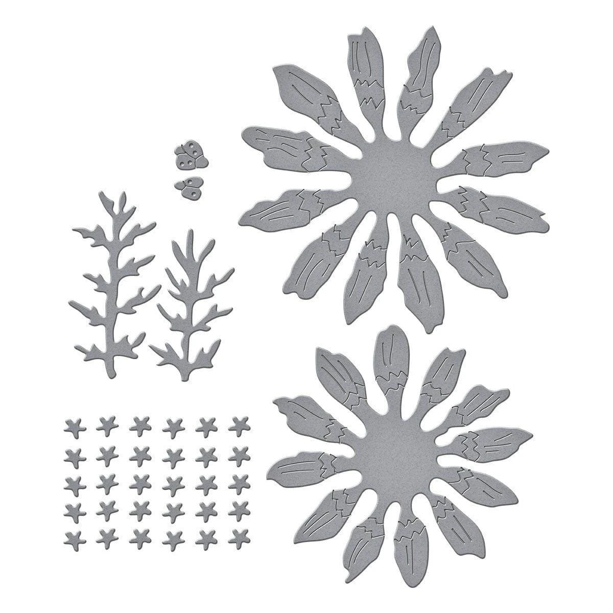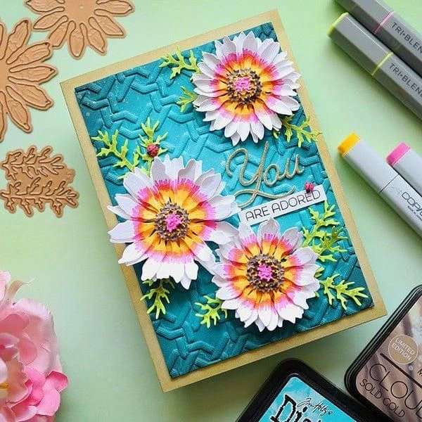 Painted Daisy Etched Dies from the Through the Meadow Collection by Susan Tierney-Cockburn. Assembled, this set of five thin metal cutting dies creates a bright and cheerful daisy-shaped flower. Known for the bright colors with its yellow disk center, they make a wonderful bouquet or floral accent design! Also included are two Susan Tierney-Cockburn signature ladybugs. The finished flower and foliage measures approximately 0.75 x 3.50 x 2.75 in./1.90 x 8.90 x 7.00 cm.