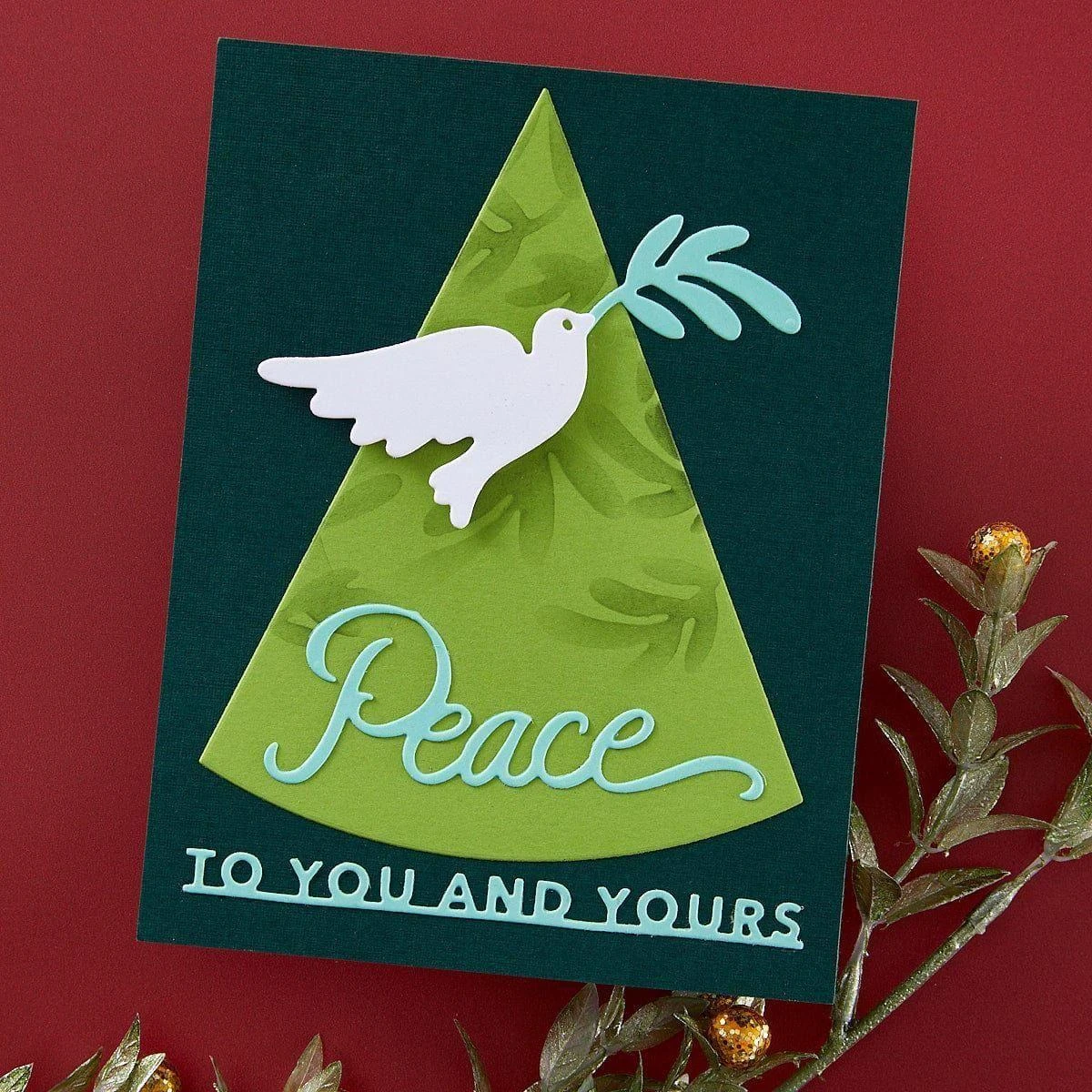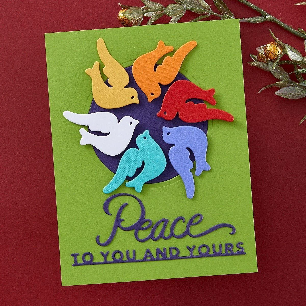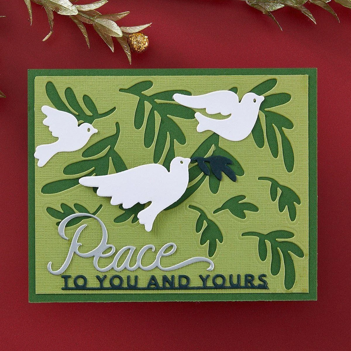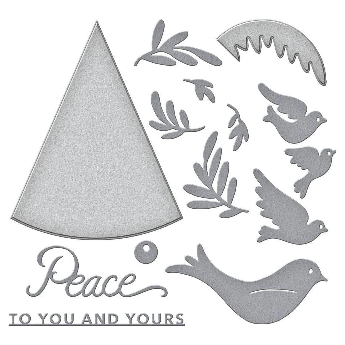 Peace Dove Etched Dies are from the Season of Wonder Collection by Stampendous. This set of 14 thin metal cutting dies includes four different sizes of doves in flight, sprigs, a large triangle tree silhouette and two sentiments, Peace and To You and Yours. Cut all in the set to create a wonderful holiday card. For more sentiment options, look to the clear stamp sets in this collection.