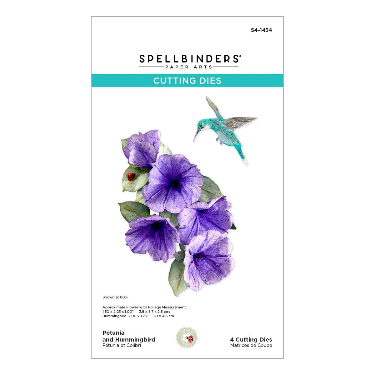 Petunia and Hummingbird Etched Dies are part of the Summer Solstice Garden Collection by Susan Tierney-Cockburn. When assembled, the set of four thin metal cutting dies makes a lovely Petunia flower and includes a hummingbird in mid-air. The finished flower with foliage measures approximately 1.50 x 2.25 x 1.00 in./3.80 x 5.70 x 2.50 cm, and the hummingbird measures 2.00 x 1.75 in./5.10 x 4.50 cm.
