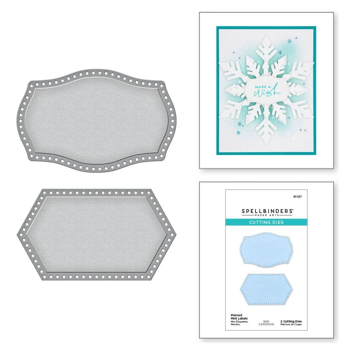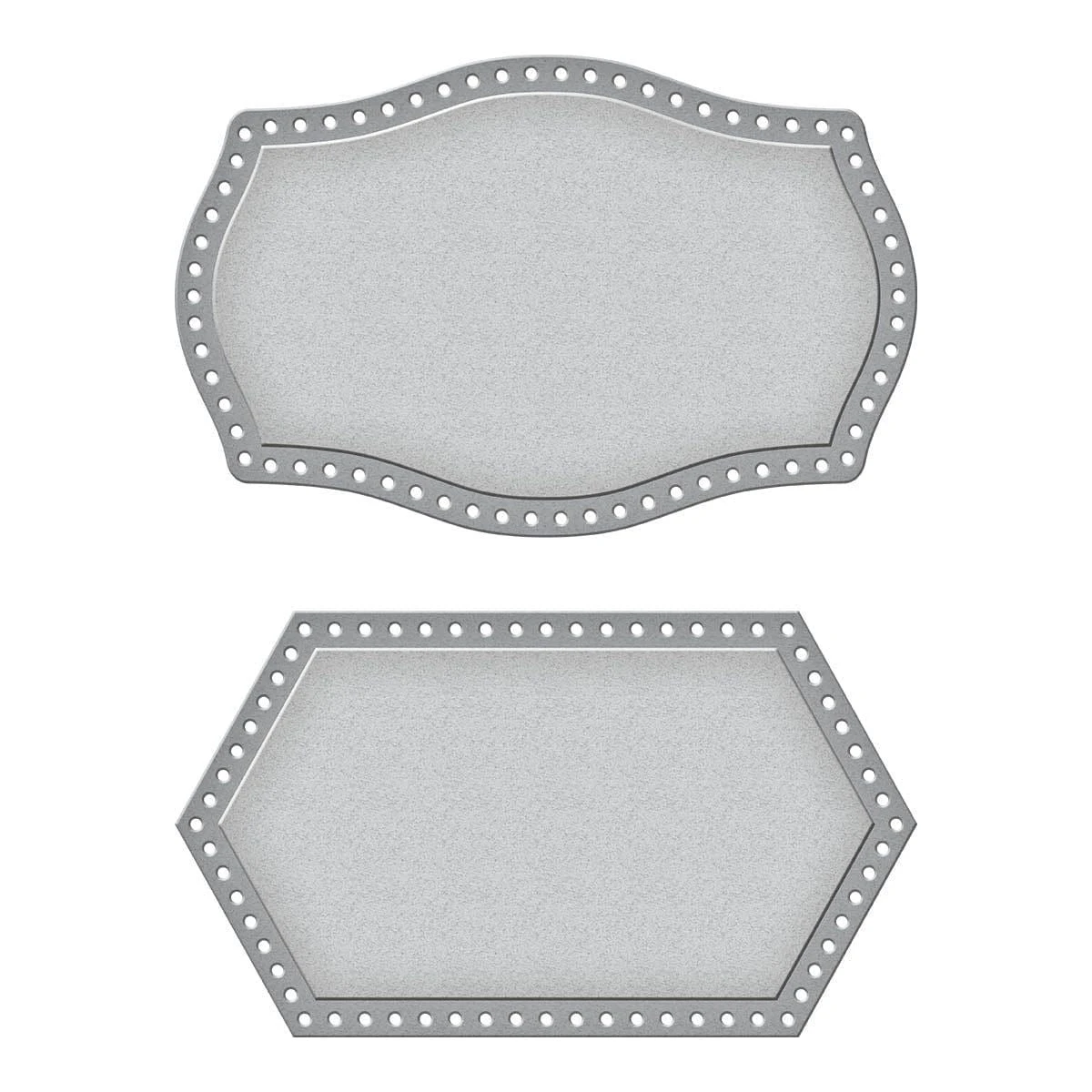 Pierced Mini LabelsEtched Dies is from the Bibi’s Snowflakes Collection by Bibi Cameron This set of two thin metal cutting dies cuts two label designs. One is a soft curved label shape, and the other has pointed ends to its shape. Both have pierced dots along the edges for a classic look.