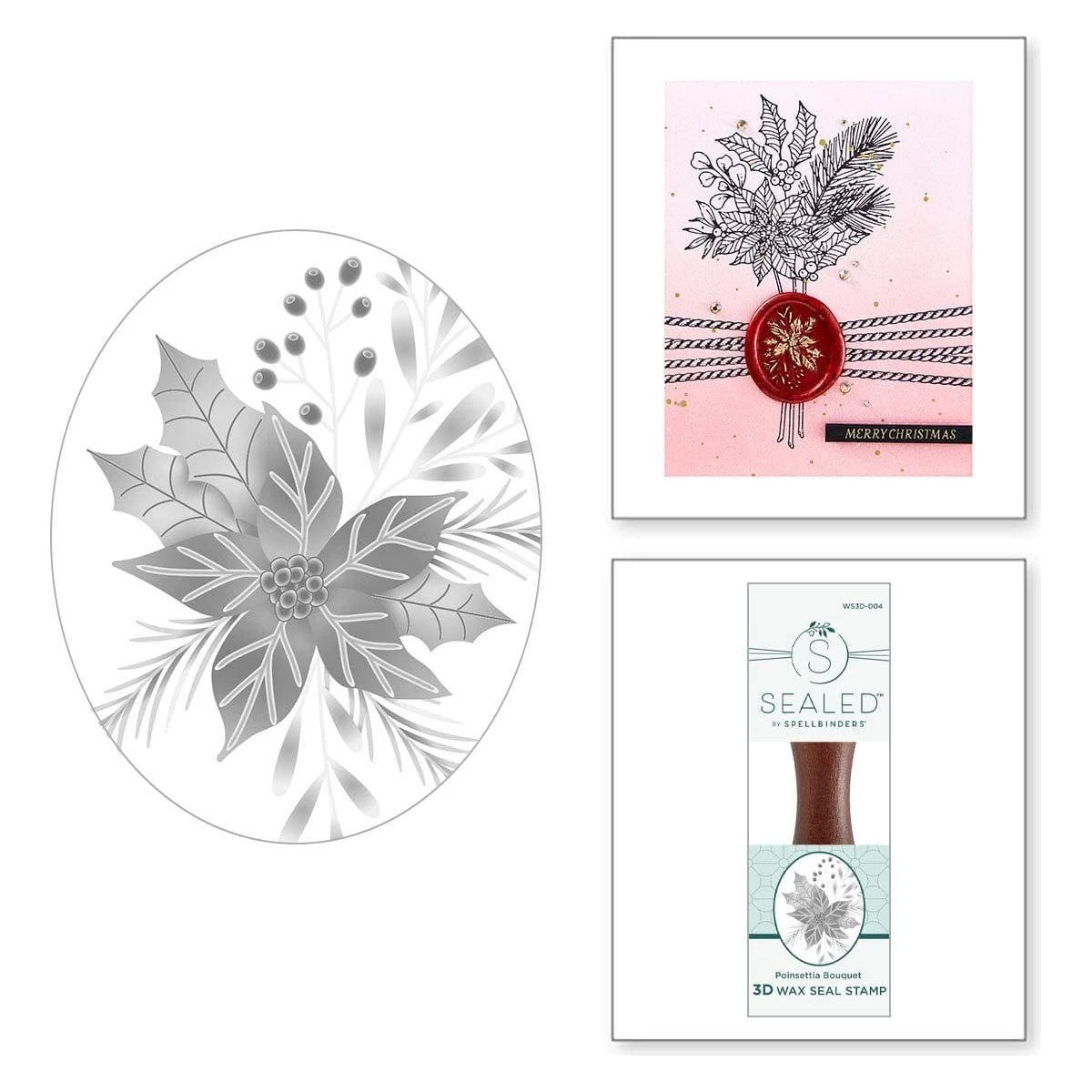 Poinsettia Bouquet 3D Wax Seal Stamp is from the Sealed 3D Christmas Collection. It has one wooden handle that supports a larger size of 1.00 x 1.25 in. oval brass stamp design on its end. It stamps a beautiful Poinsettia floral arrangement…a wonderful way to accent any holiday project!
