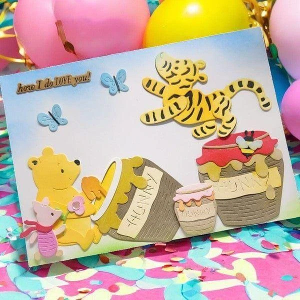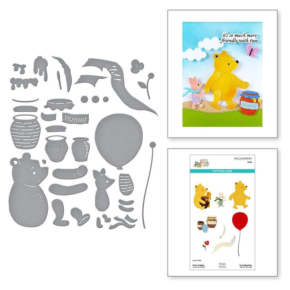 Pooh & Piglet Etched Dies are from the Say Cheese Classic Pooh Collection. This set of 19 thin metal cutting dies creates the sweet duo of Pooh and his friend, Piglet. It comes with other accessories that go with the duo such as a balloon, flower, honey pots, pen, and scroll. Pairs well with S4-1428 Pooh’s Hunny Pot Etched Dies and S5-683 Tigger & Eeyore Etched Dies.