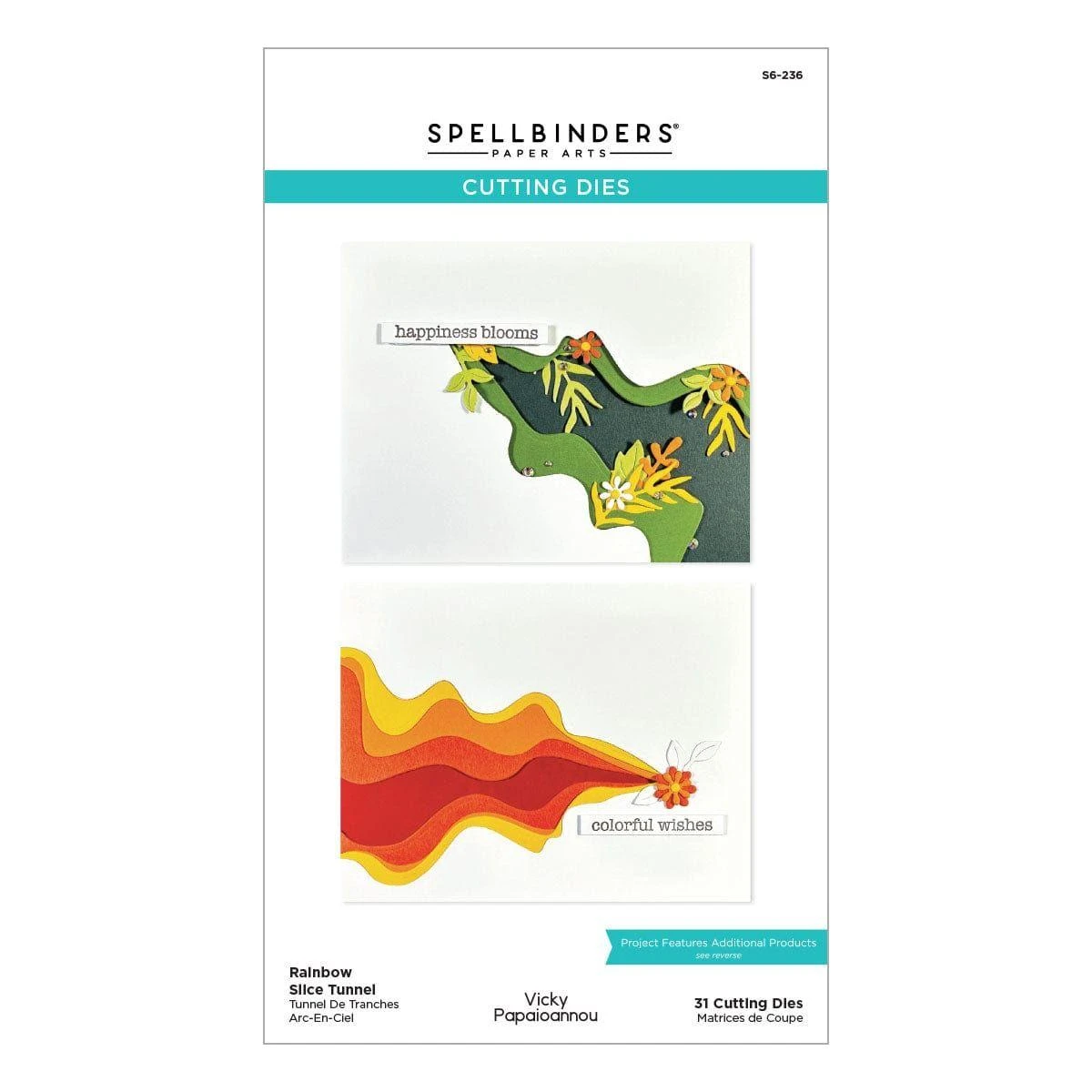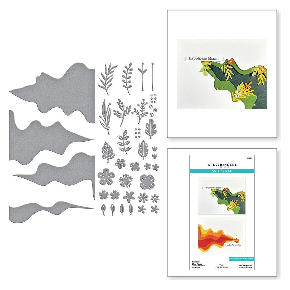 Rainbow Slice Tunnel Etched Dies are part of the Tunnel Scapes Collection by Vicky Papaioannou. This fun set is not your typical tunnel but like a slice or V-shape. Add vibrant colors of the rainbow in the different slice sizes. Get crazy and tuck in bold colorful blooms which are also included in this set of 31 thin metal cutting dies. So many ideas! This unique offering creates many tunnel sceneries from the ocean to the sky, and everything in between.