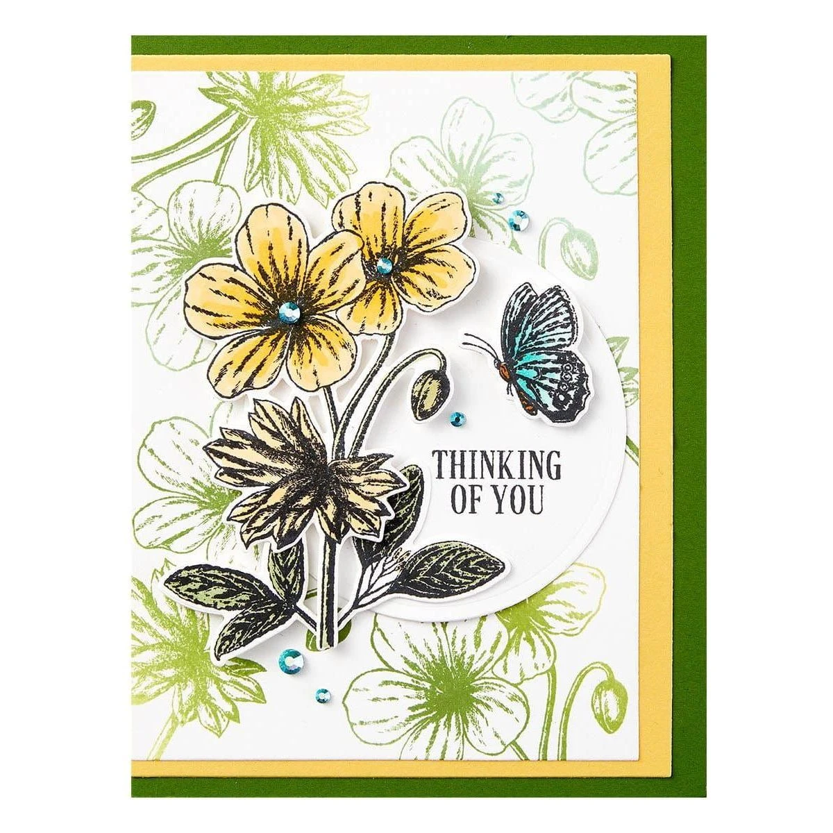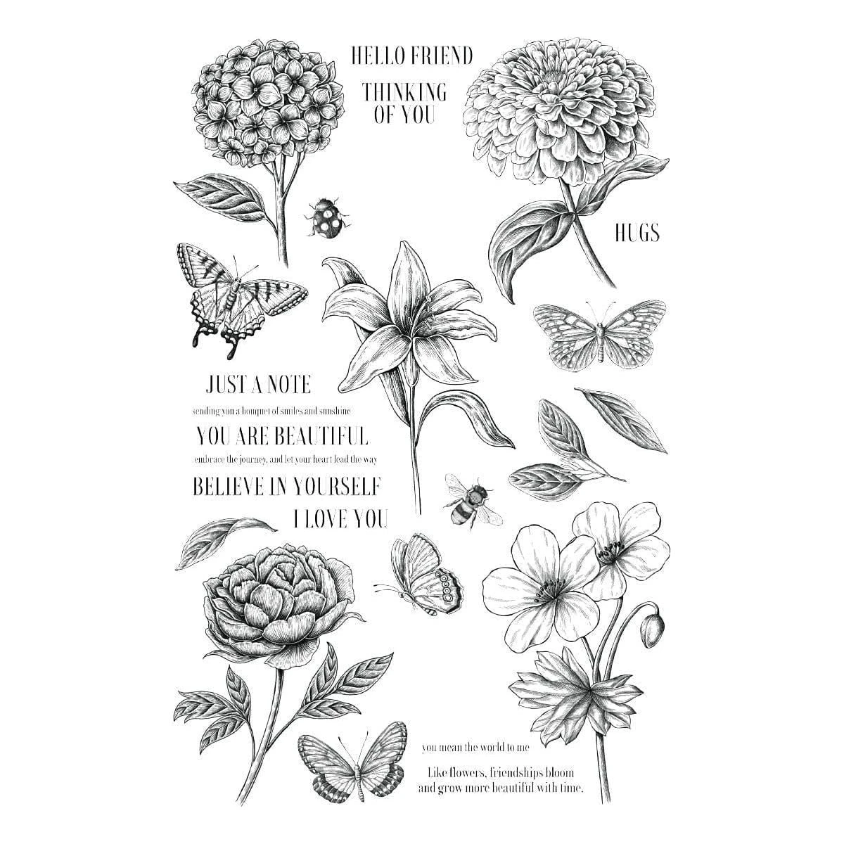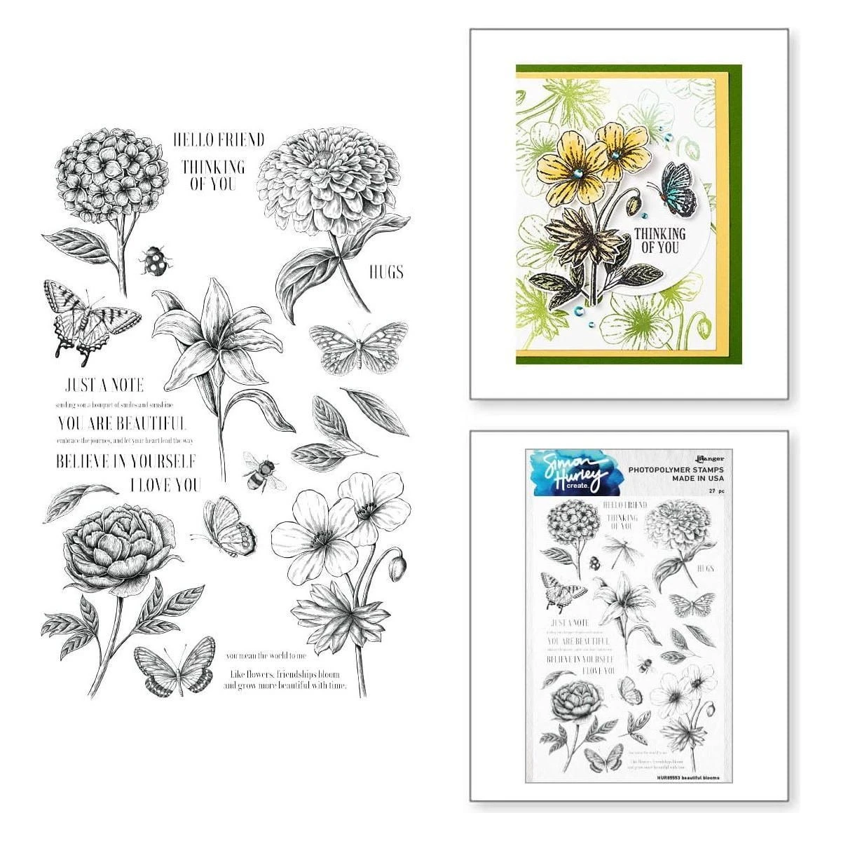Ranger Beautiful Blooms Clear Stamp Set by Simon Hurley create is a set of 24 clear stamps. There are five different flowers, four butterflies, a dragonfly and bee, a selection of leaves, as well as eight sentiments. This set coordinates with S7-243 Beautiful Blooms Etched Dies set to die-cut the stamped pieces for additional versatility. Use these stamps on an acrylic block and they are made in the U.S.A.