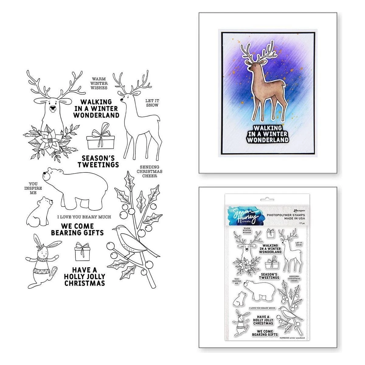 Ranger Clear Stamp Set Winter Woodland by Simon Hurley Create features 17 stamps to create adorable holiday cards and crafts with winter animals and seasonal sentiments. Use these stamps as center pieces or decoration on crafts to bring in the winter season spirit! Coordinates with die set Winter Woodland S7-227 (sold seperately).