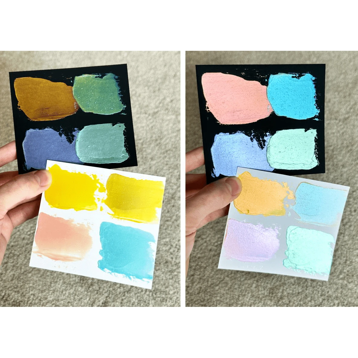 - Color can be subtle on white cardstock, but reveals an intense colored shine when applied to black.
