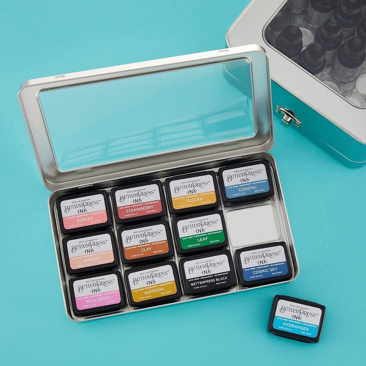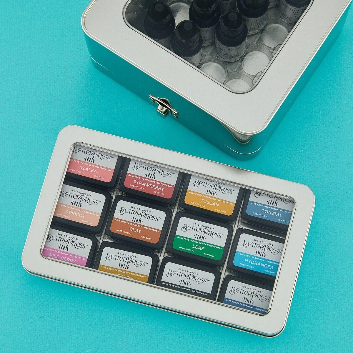 Ranger – Mini Archival Ink Storage Tin is your perfect storage companion for BetterPress Ink Pads. Simplify the organization and transportation of your ink collection with this handy, hinged tin featuring a clear window. With built-in dividers, it effortlessly accommodates and grants easy access to as many as 12 BetterPress Ink Pads. It’s compact and practical.