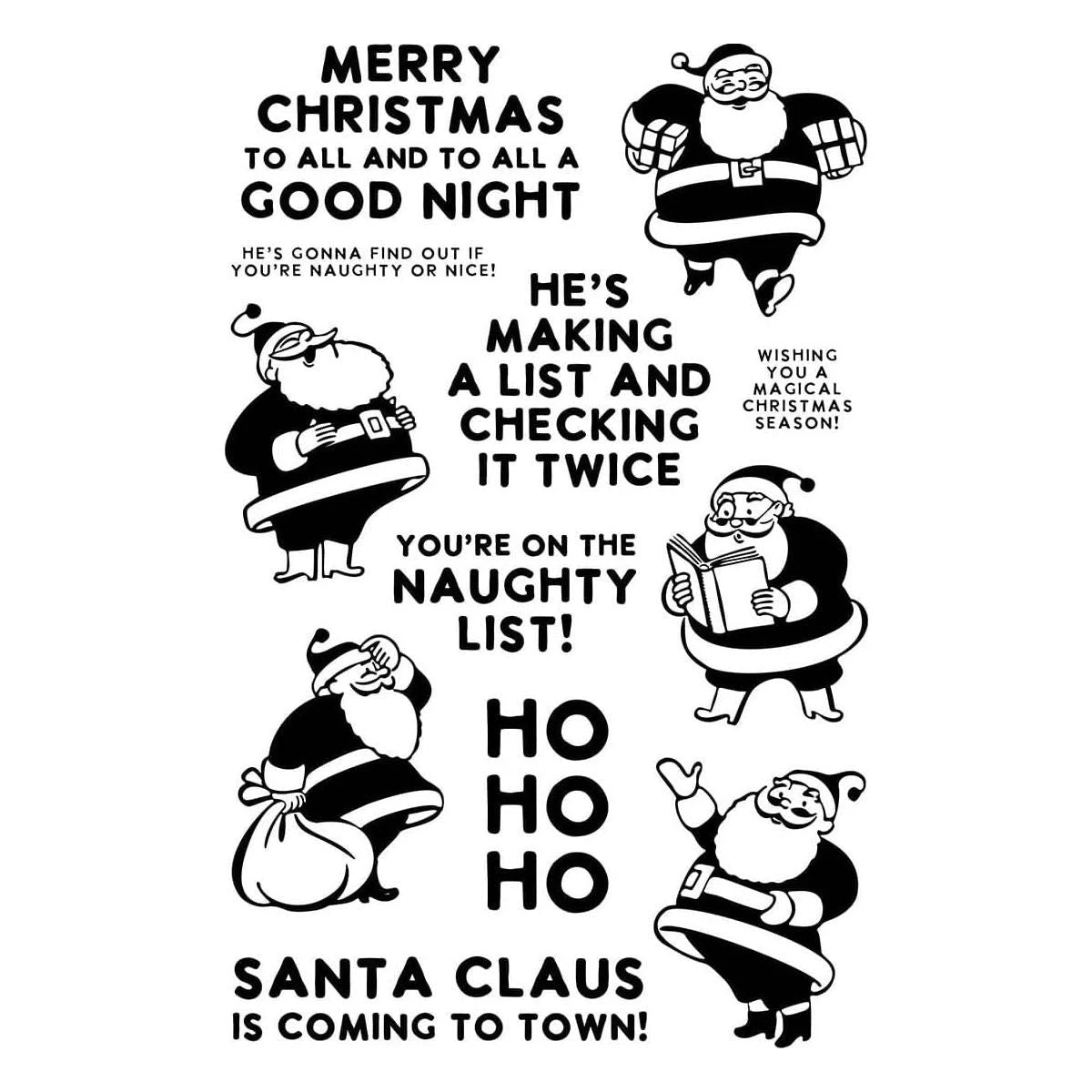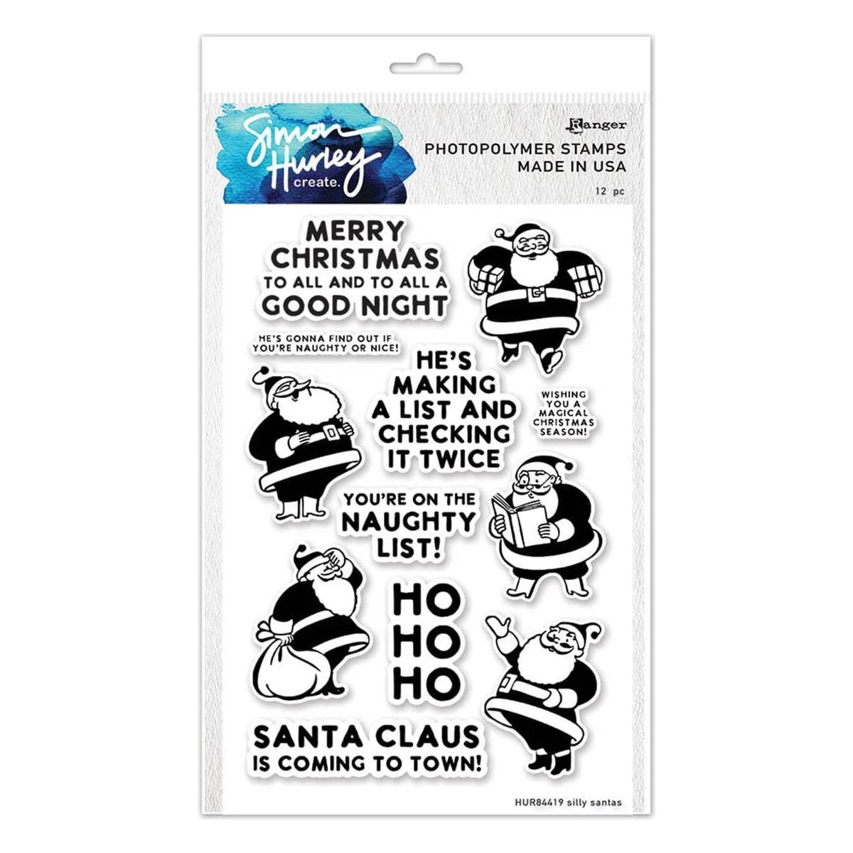 Ranger Silly Santas Clear Stamp Set by Simon Hurley create is a set of twelve stamps that make a set of fun, stylized Santas in a variety of poses. These cute characters are a perfect focal point for a card, but can also make an adorable pattern for any project! Depicted in this stamp set are five varieties of Santa and seven sentiments, including “You’re on the Naughty List!,” “Santa Claus is Coming to Town!” and “Wishing You a Magical Christmas Season.” Combine with the coordinating dies in S5-605 Silly Santas Etched Dies to create a fun dimensional card ideal for holiday gift-giving.