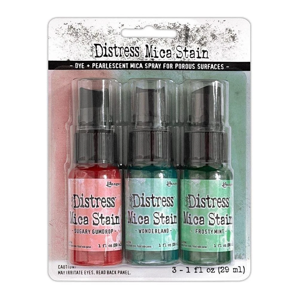 Ranger – Tim Holtz Distress® Mica Stains infuse vibrant, pearlescent radiance into your paper crafts or mixed media undertakings. These versatile Mica Stains securely bond to a variety of surfaces, such as paper, canvas, wood, fabric, and other porous materials. They pair beautifully with Distress Ink, Oxide, Spray Stain, and Oxide Spray, enabling you to craft stunning, radiant effects and captivating backgrounds. Each set comprises three 1 fl oz bottles, featuring the enchanting hues of Sugary Gumdrop, Wonderland, and Frosty Mint.