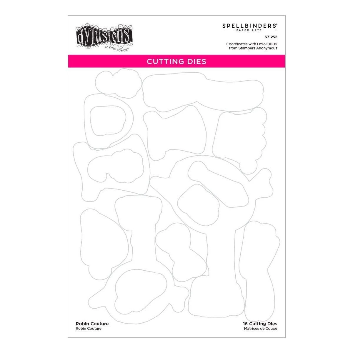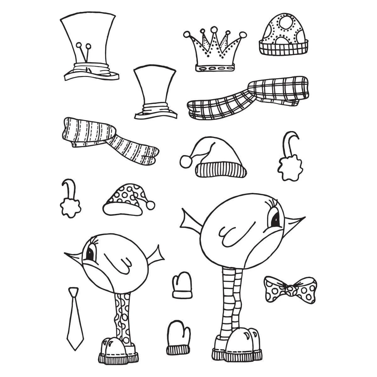 Robin Couture Cling Stamp and Die Bundle is from Stamps & Dies by Dyan Reaveley. It includes Robin Couture Etched Dies and DYR-10009 Robin Couture Cling Stamps. Together, they two side-facing birds with long legs, accessorized in fun outfits of hats, scarves, ties and more. Adds wonderful whimsy to your projects! Use with an acrylic stamping block.