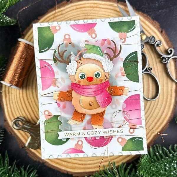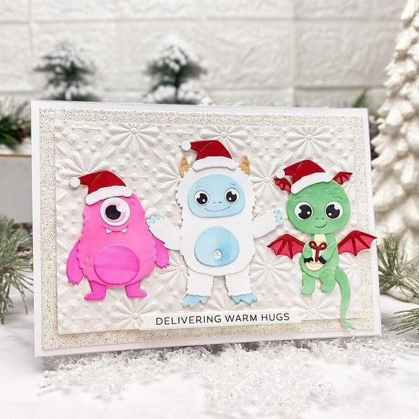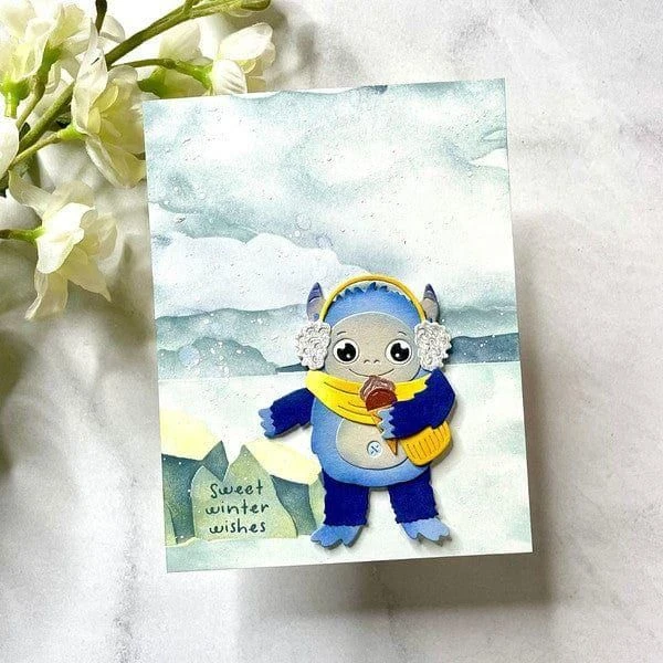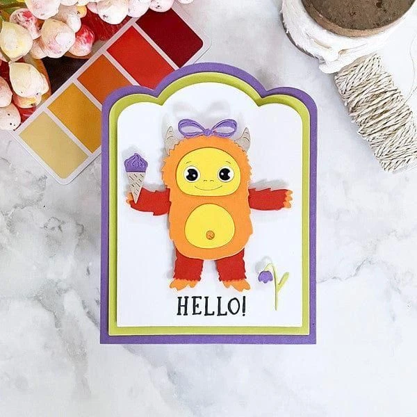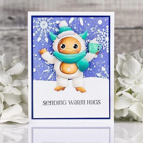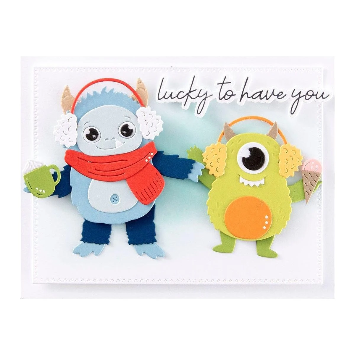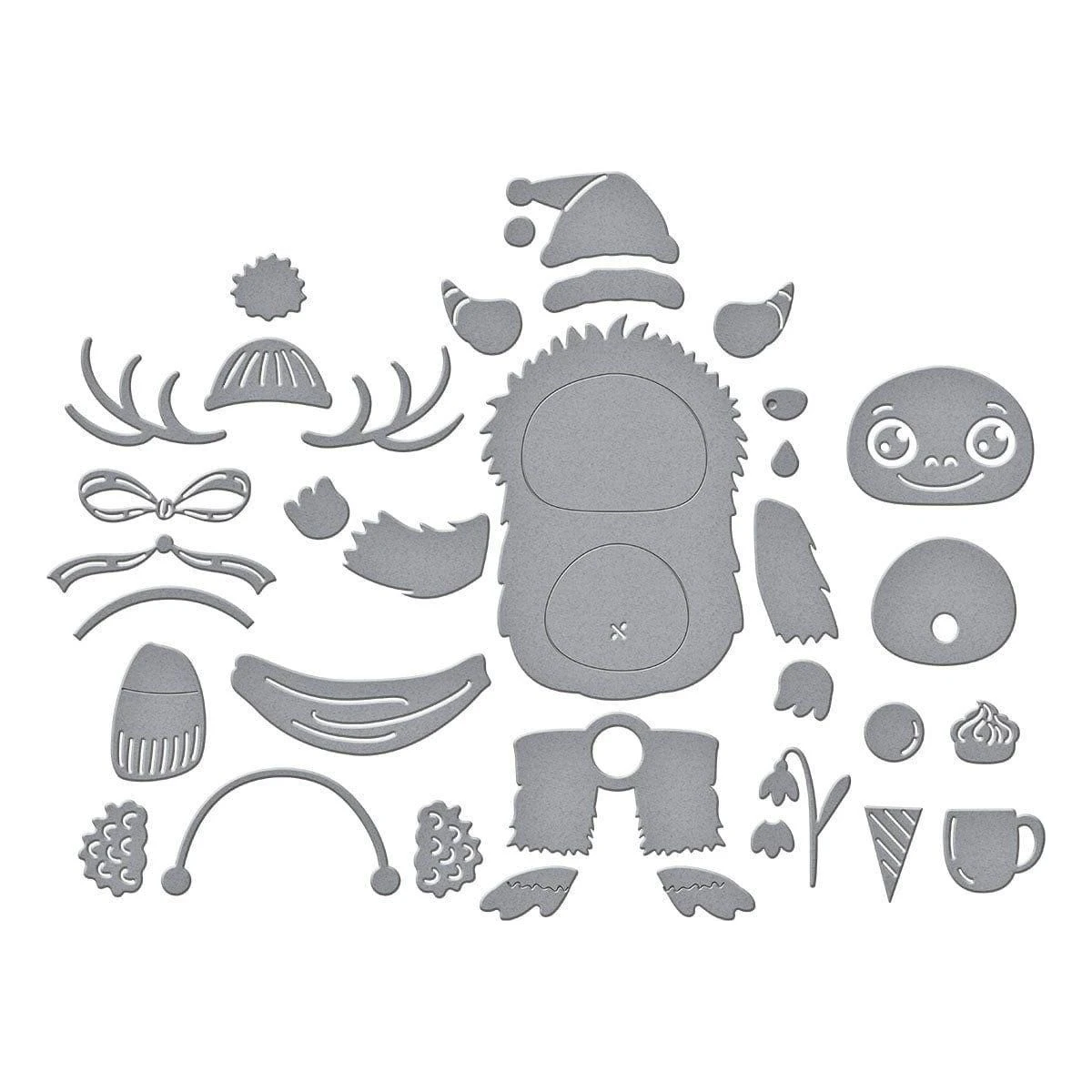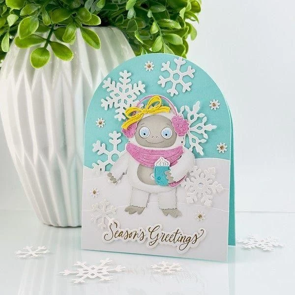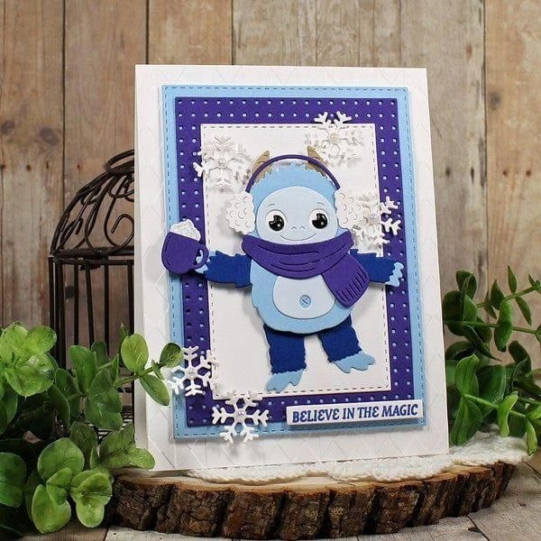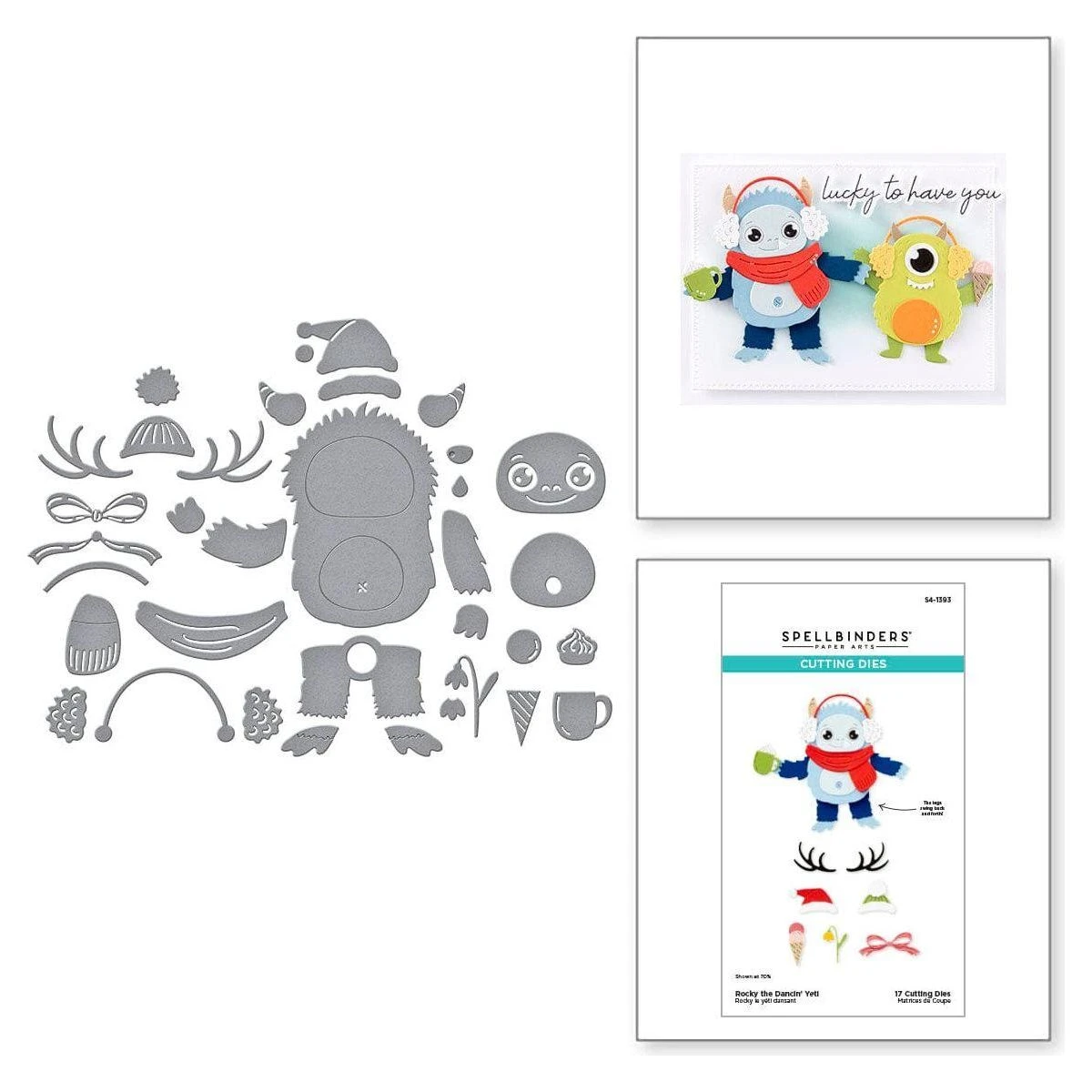 Rocky the Dancin’ Yeti Etched Dies are part of the Monster Friends Collection. Who can resist this adorable dancing Yeti? Snuggly and fun accessories like a hat and cup of cocoa are also included to help this Yeti stay warm in his snowy home! And yes, the legs swing back and forth to give this cute monster movement and whimsy. Rocky is perfect for holiday cards and scrapbook pages… or just a little bit of silliness any time of the year! Collect all the monsters if you haven’t already, including S2-378 Dancin’ Birthday Panda, S3-495 Dancin’ Birthday Monster, S3-497 Dancin’ Birthday Dragon, and S3-498 Birthday Dinosaur (this one is stationary but so cute!).