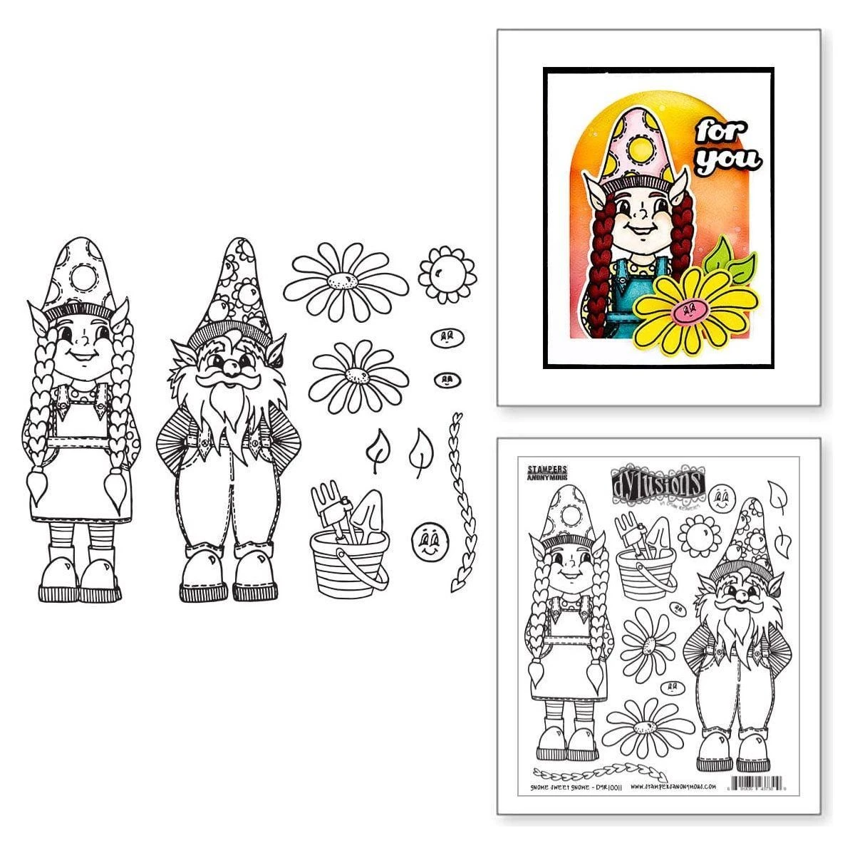 Gnome Sweet Gnome Cling Stamps are from Stamps & Dies by Dyan Reaveley. It creates a sweet gnome couple and their bucket full of garden tools ready for spring! Other accents include flowers, leaves, a row of hearts and happy faces. Use with an acrylic stamping block.
