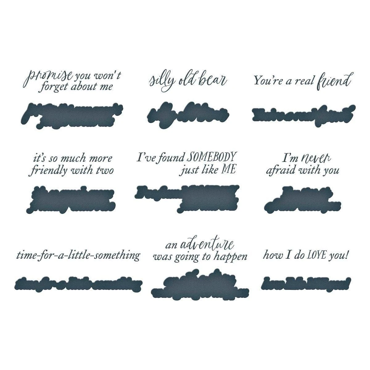 Say Cheese Classic Pooh BetterPress Bundle are part of the Say Cheese Classic Pooh Collection. It includes both BP-285 Silly Old Bear Sentiments Press Plate & Die Set and BP-286 Friendly Moments Press Plates. Used together, they help to set the mood of the two scenes with various sentiments.