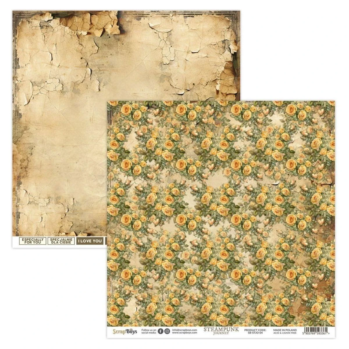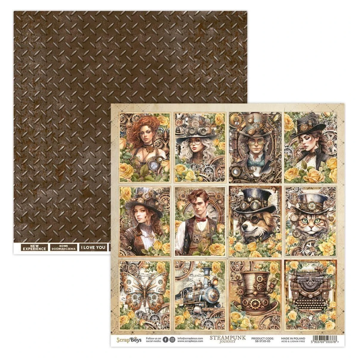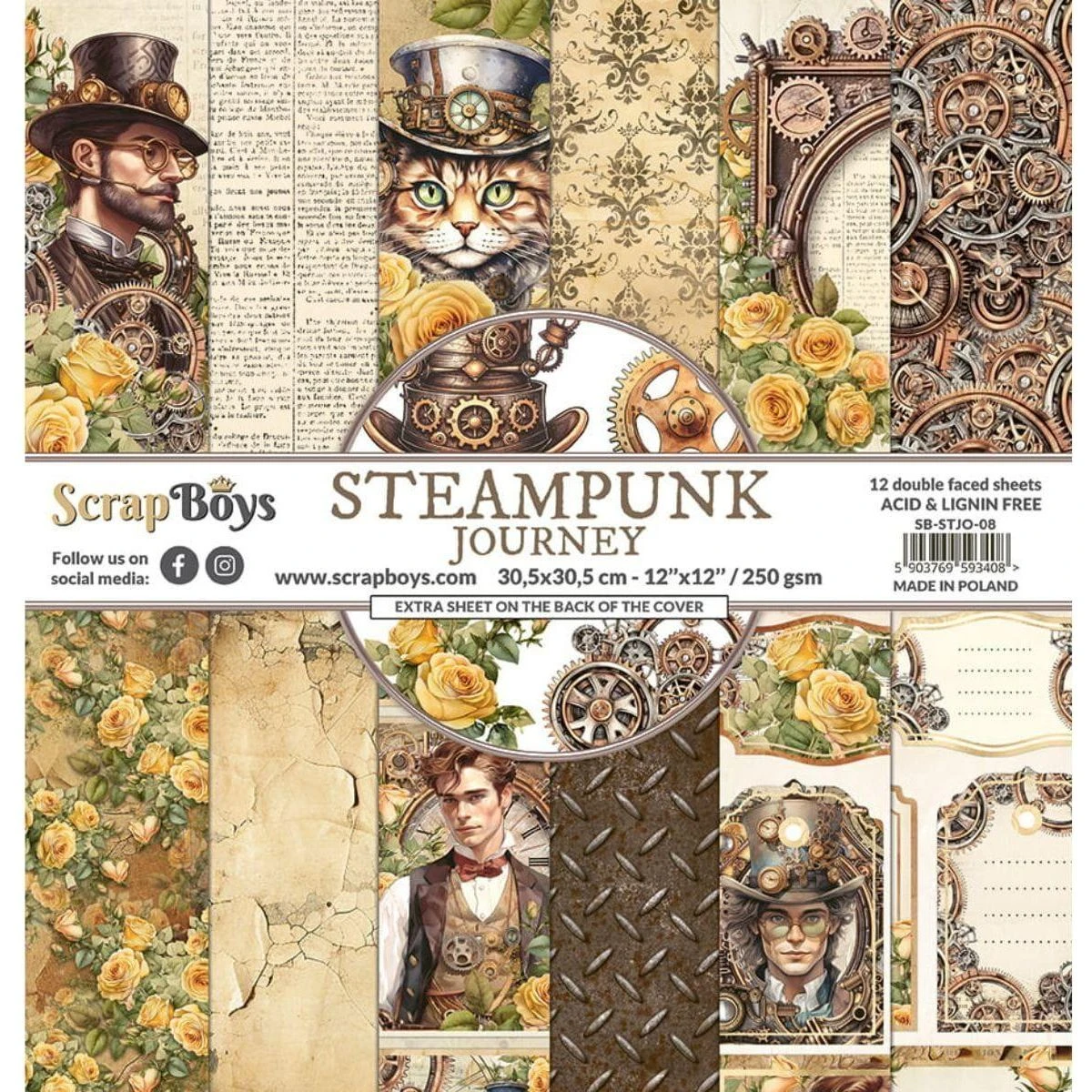 ScrapBoys – Steampunk 12×12 The Scrap Boys Steampunk Scrapbooking Paper features a collection of 12 double-faced sheets with a vintage aesthetic. The designs include elements like gears, clocks, flowers, vintage keys, and cats in steampunk attire. Each sheet measures 30.5×30.5 cm (12×12 inches) and is made from 250 gsm acid-free and lignin-free paper. The paper is manufactured in Poland and includes an extra sheet on the back of the cover.