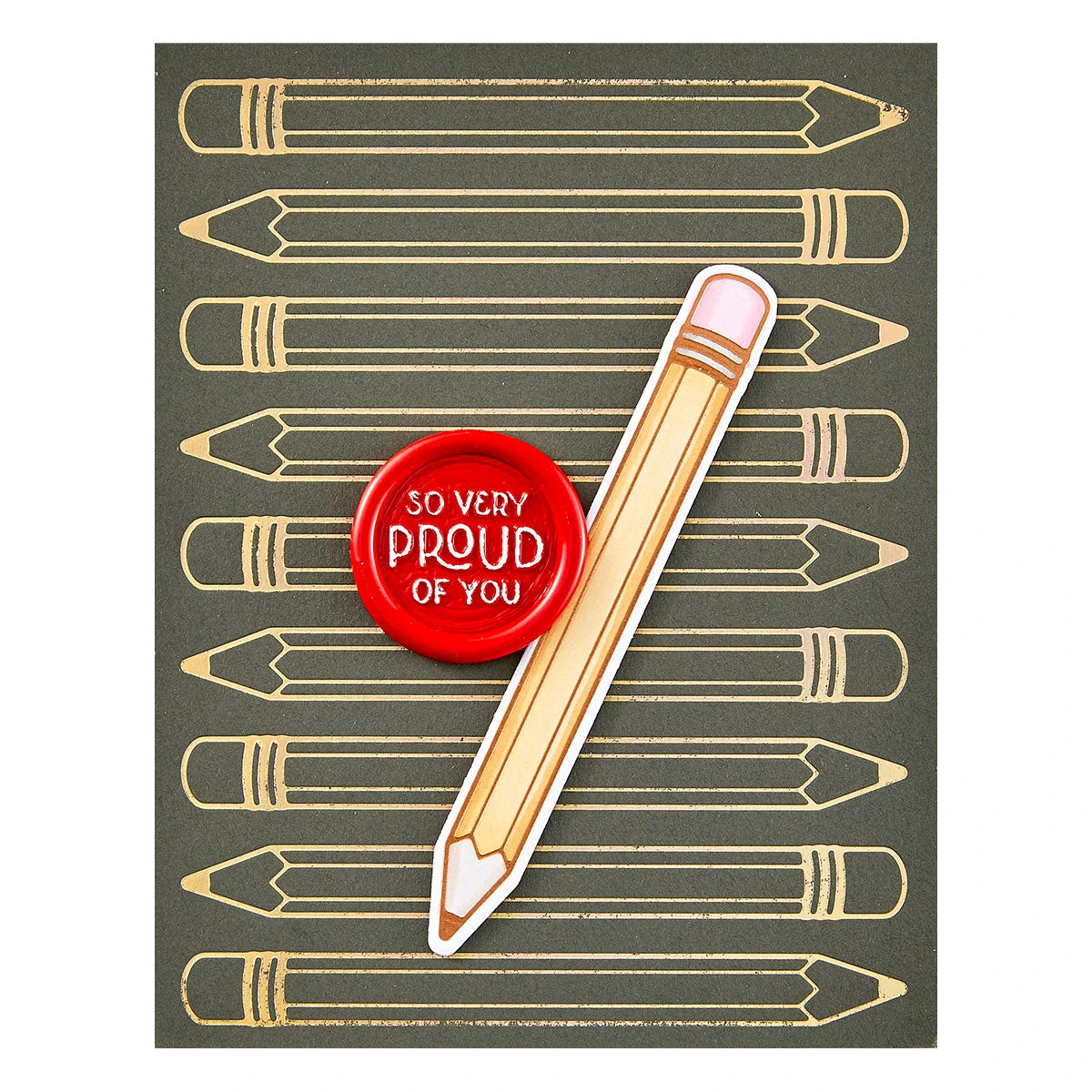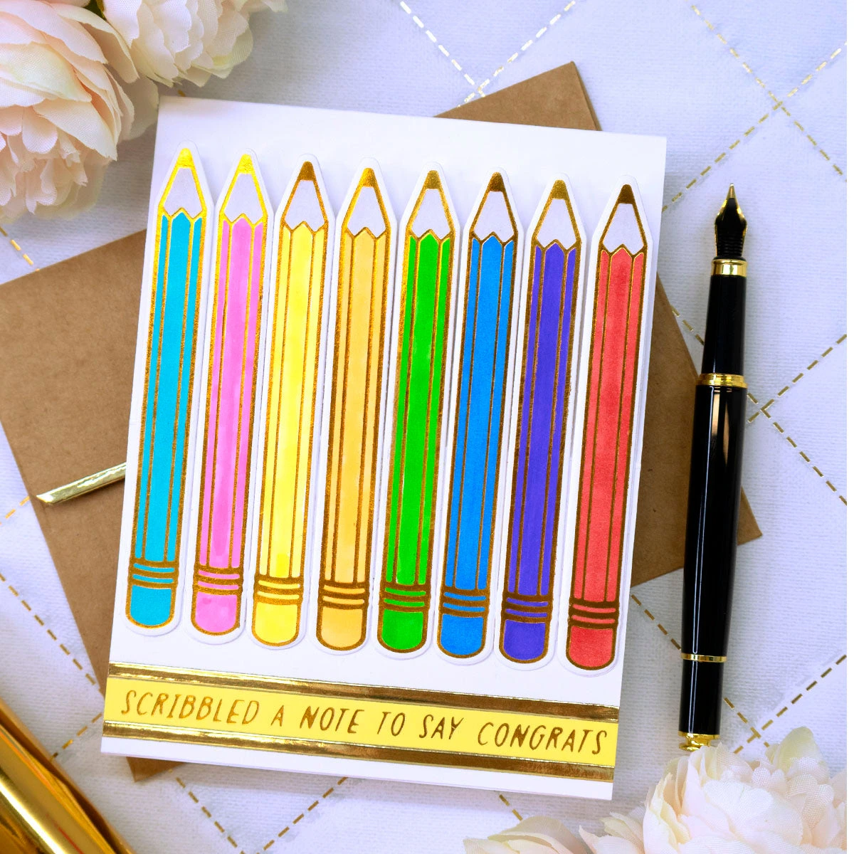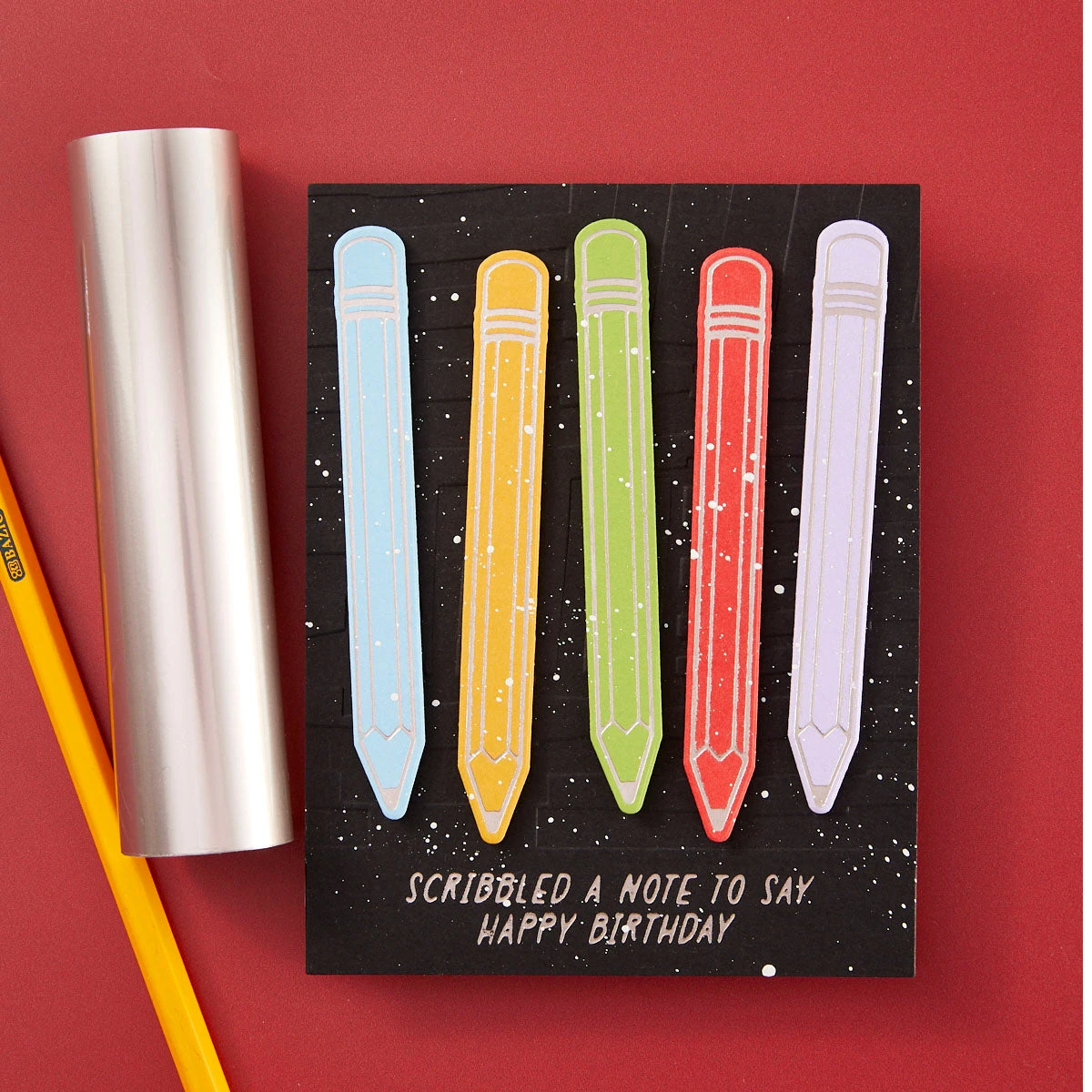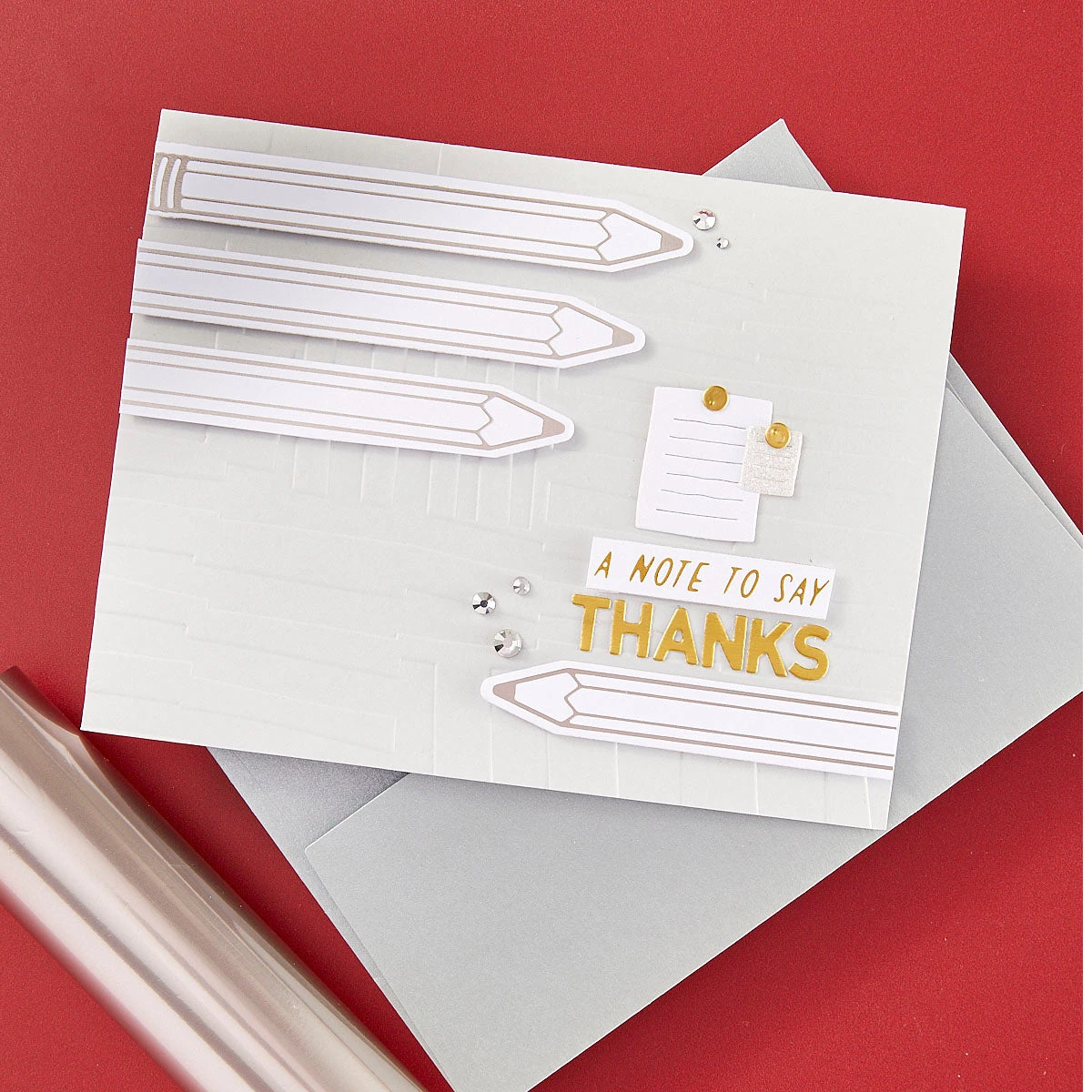 This playful set includes a full background of lined pencils, a coordinating die-cut pencil, and foil phrases like “Scribbled a note to say,” “Congrats,” “Happy Birthday,” and more. Use it with your favorite Glimmer Hot Foil System to add shimmering metallic shine to cards, tags, planners, and more. Layer with bold colors or keep it sleek and simple—the creative possibilities are endless!