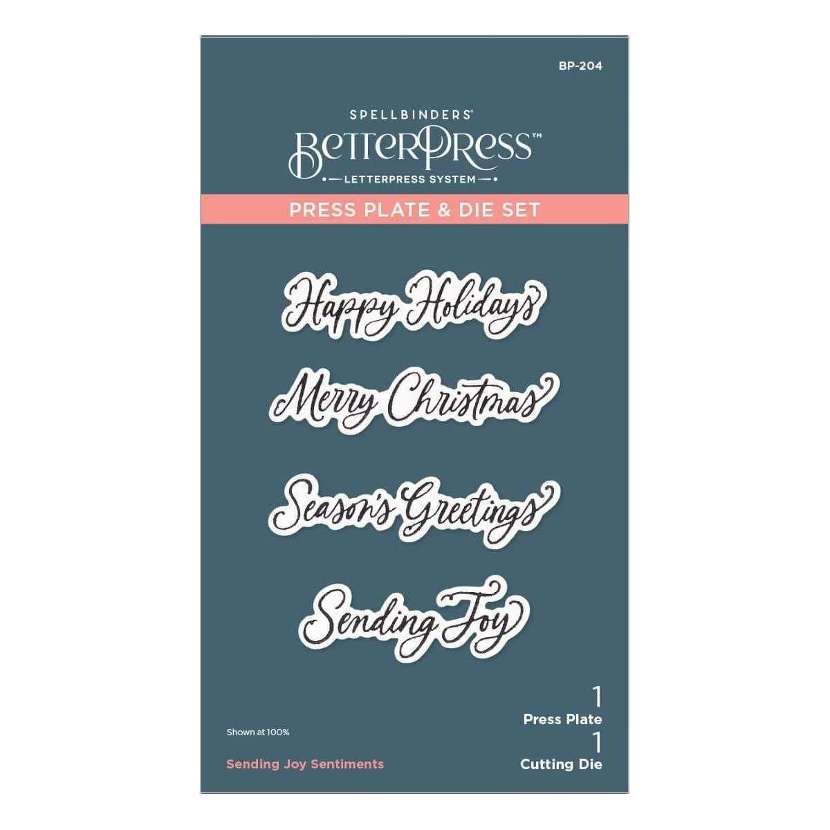 Sending Joy Sentiments Press Plate & Die Set is from the Home for the Holidays Collection. This time saver is a set of one press plate and matching thin metal cutting die. The plate imprints a list of four classic holiday sentiments in a cursive font. Die-cut with its matching die all at once for four separate greetings! Ink the plates with the BetterPress Ink to be pressed against the BetterPress Cotton Card Panel and Sheets for a crisp letterpress design.