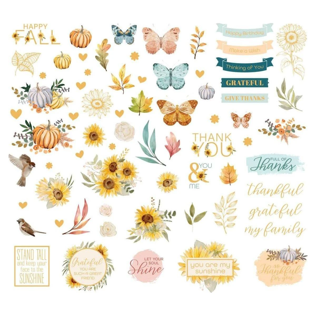 Serenade of Autumn Printed Die Cuts are from the Serenade of Autumn Collection. The 138 die cut shapes is full of harvest florals and greenery, pumpkins, butterflies, birds and sentiments. This delightful assortment is all you need to create sweet fall cards and scrapbook pages.