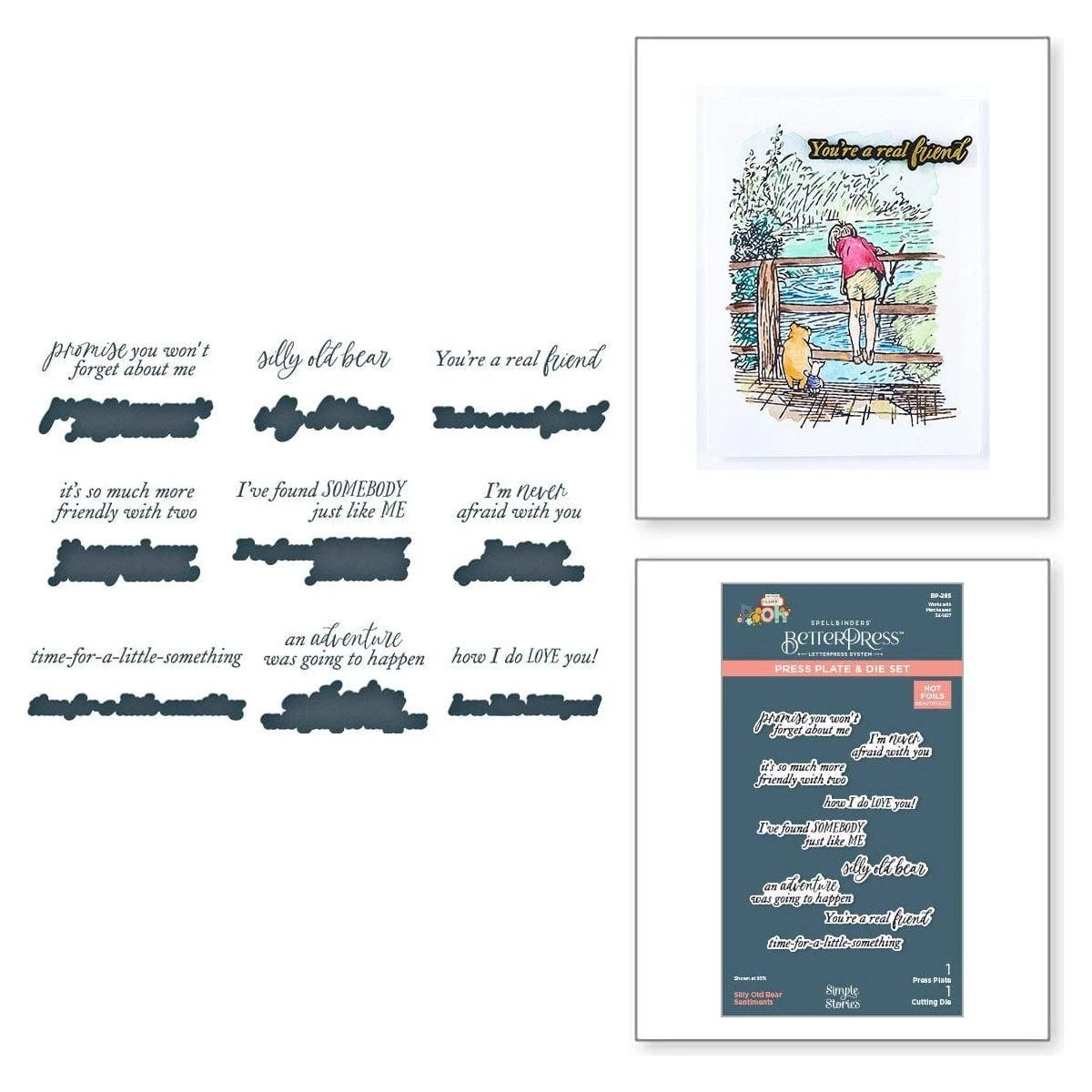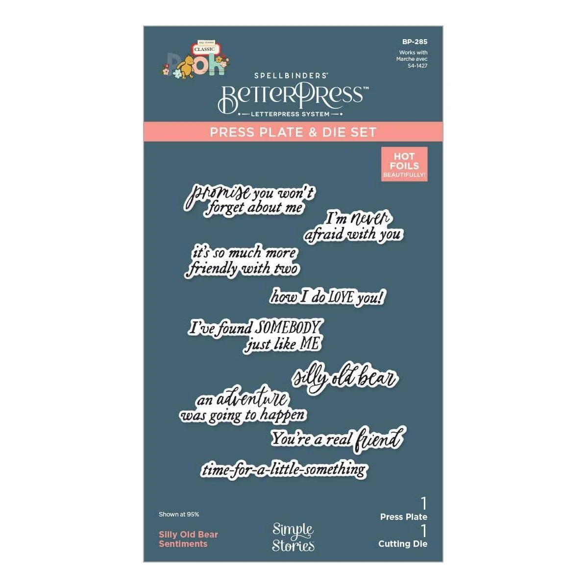 Silly Old Bear Sentiments Press Plate & Die Set is part of the Say Cheese Classic Pooh Collection. The one plate presses eight sweet Pooh phrases all at once and cut with its matching thin metal cutting die for a time-saving step. Used with BP-286 Friendly Moments Press Plates to set the mood in the two scenes. It also works well with the S4-1427 Memory Frames Etched Dies to anchor the ensemble. Ink the plates with the BetterPress Ink to be pressed against the BetterPress Cotton Card Panel and Sheets for a crisp letterpress design.