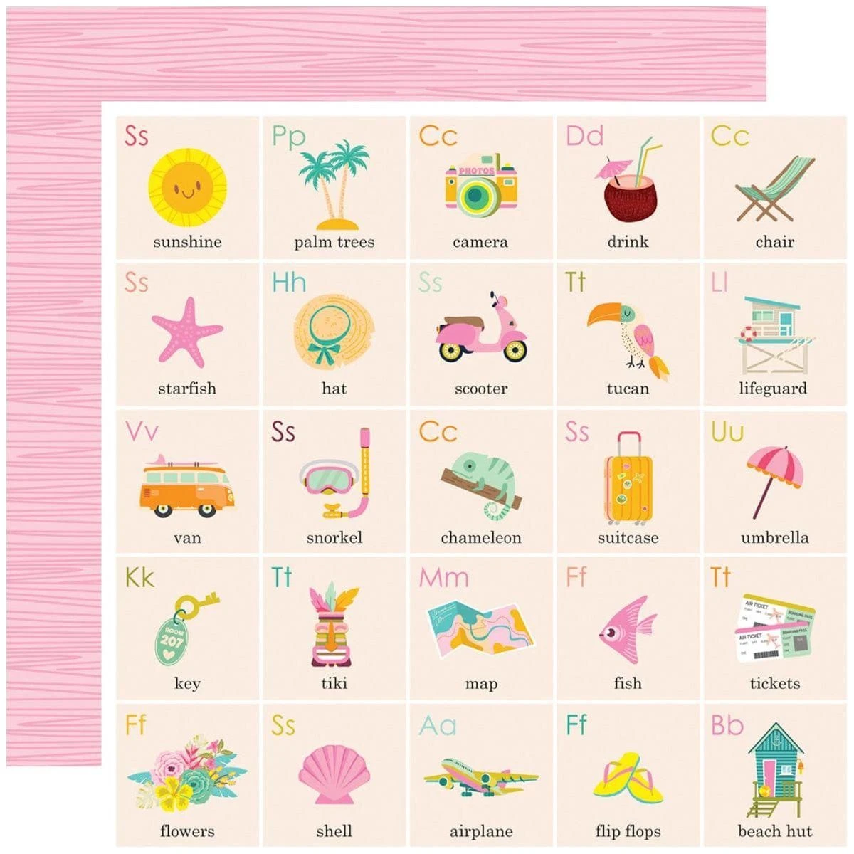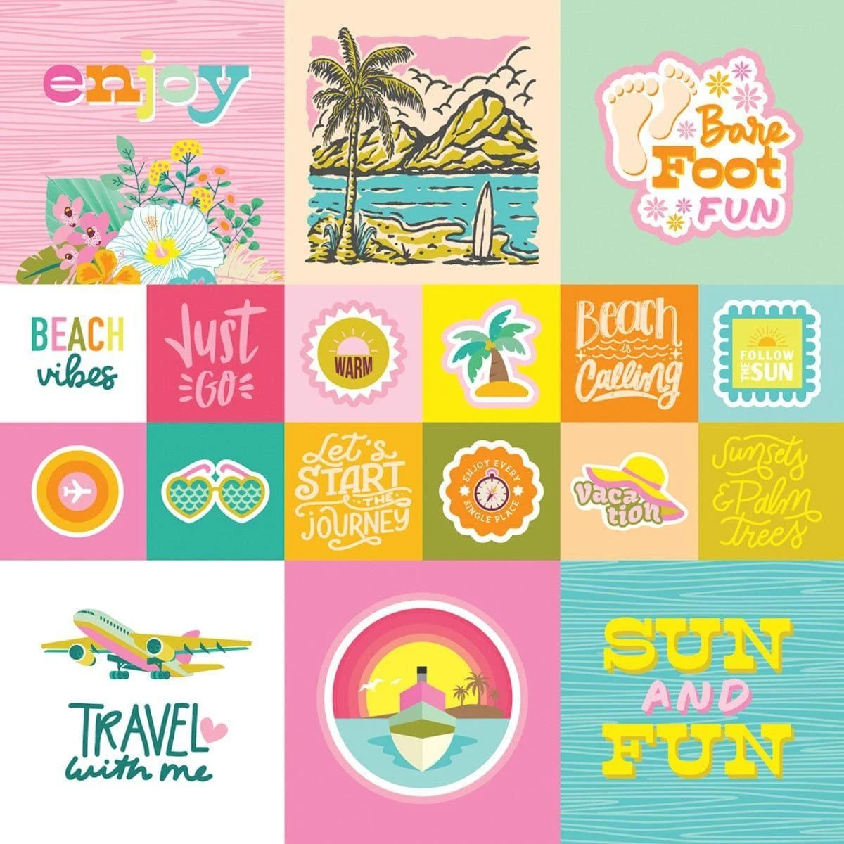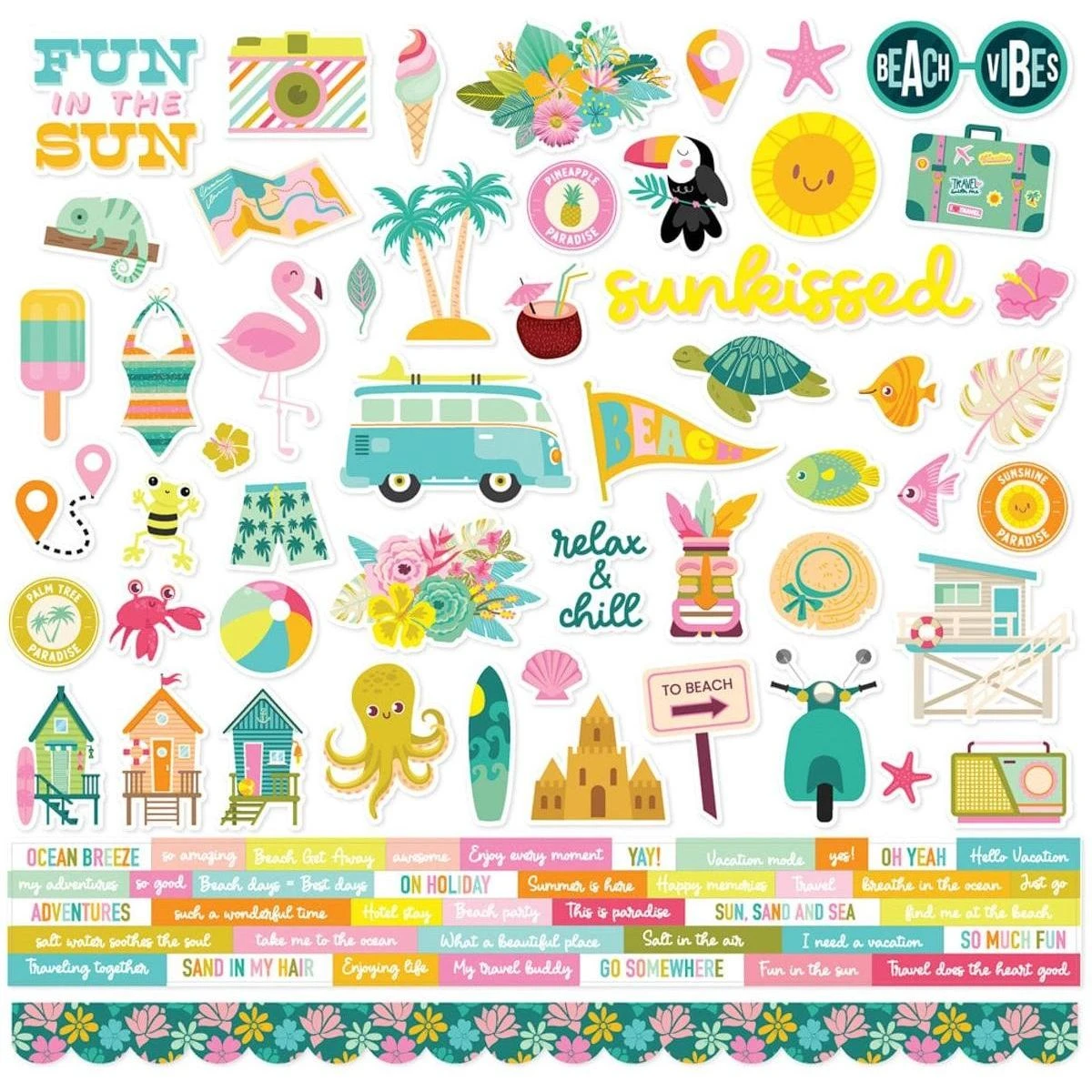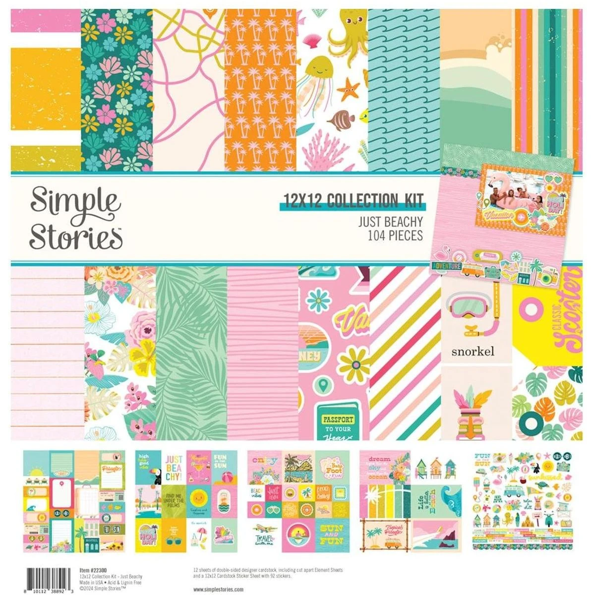 Simple Stories – Just Beachy Collection Kit from Simple Stories includes 12 sheets of double-sided 12×12 Designer Cardstock which includes cut apart sheets, and a 12×12 Cardstock Sticker Sheet. Total of 104 pieces in this kit.