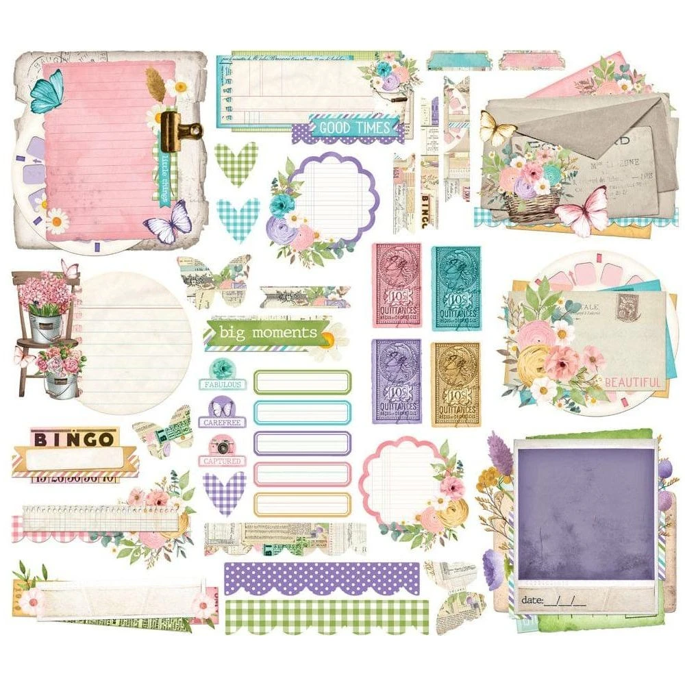 Featuring an assortment of vintage-inspired designs like tickets, tags, florals, butterflies, and heartfelt sentiments, this collection exudes charm and nostalgia. The soft pastel palette and intricate details make these pieces ideal for layering and creating dimension in your projects.