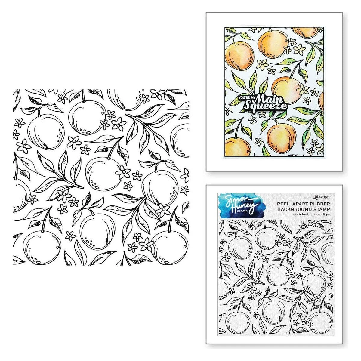 Sketched Citrus Stamp and Die Bundle by Simon Hurley brings together a cheerful summery background of oranges and leaves! Use the outline die to cut perfect oranges and flowers with casual sketchy lines, then use a foam square to pop them up off the stamped background for a stunning, dimensional card front.