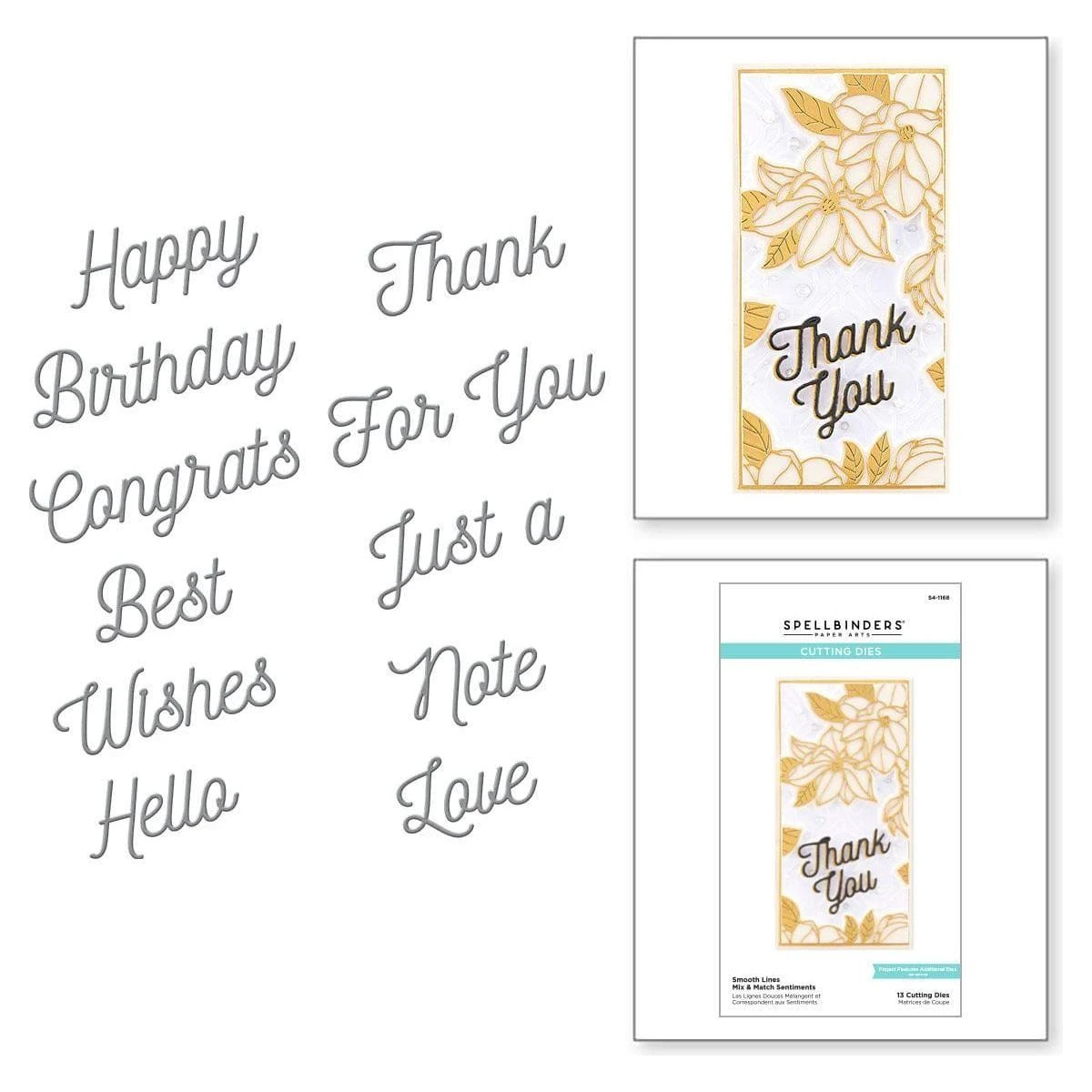 The Smooth Lines Mix & Match Sentiments Etched Dies is from the Be Bold Collection. This set of 13 thin metal dies creates phrases and greetings, all in a narrow casual script font. Perfect for your paper crafting projects.