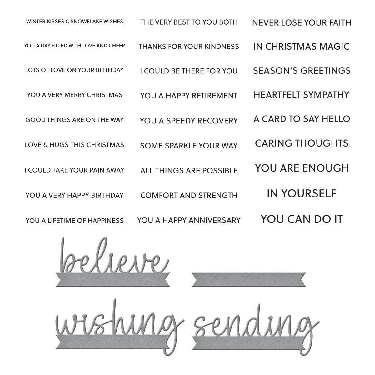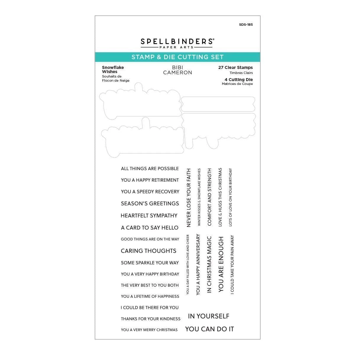 Snowflake Wishes Clear Stamp & Die Set is from Bibi’s Snowflakes Collection by Bibi Cameron. This fun set of 27 clear stamps and four thin metal cutting dies creates a variety of sentiments with the help of the three sentiment dies: Sending, Wishing and Believe. Just stamp your greeting to complete the phrase. Stamp in the banner die to make it stand out or pop up for dimension! Lots of options!
