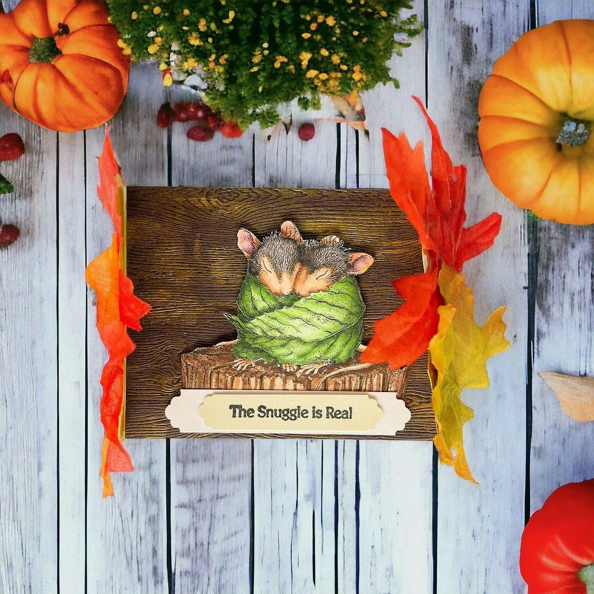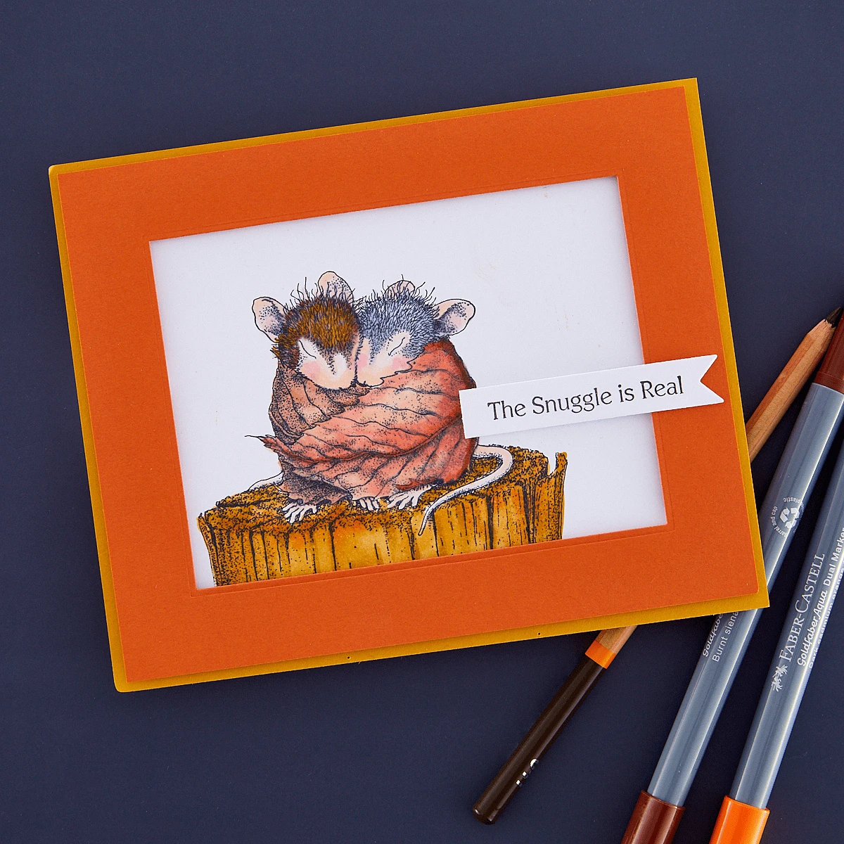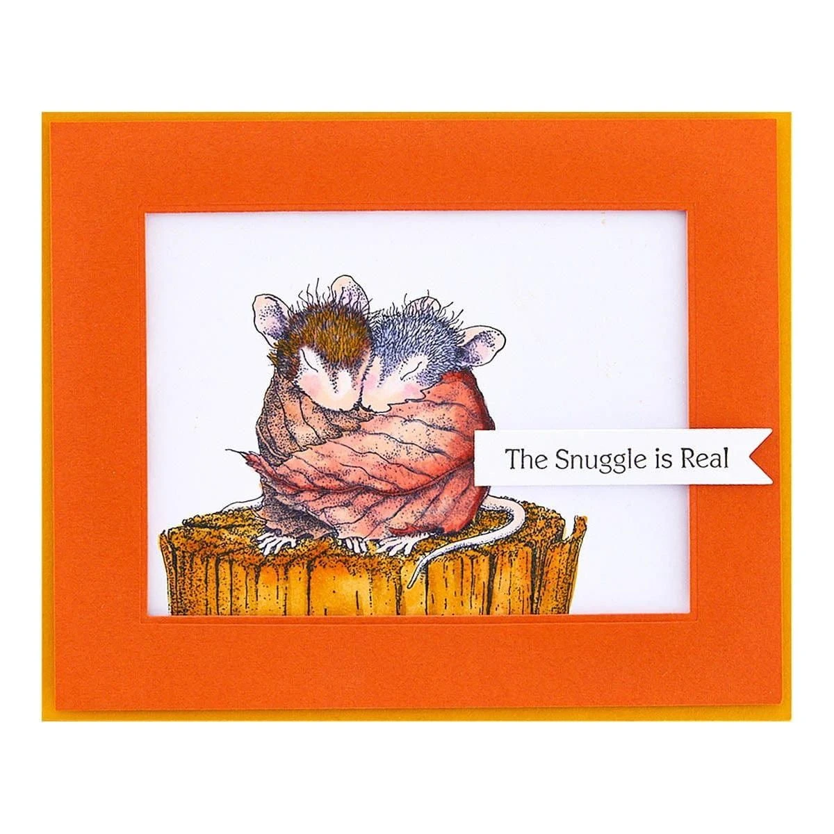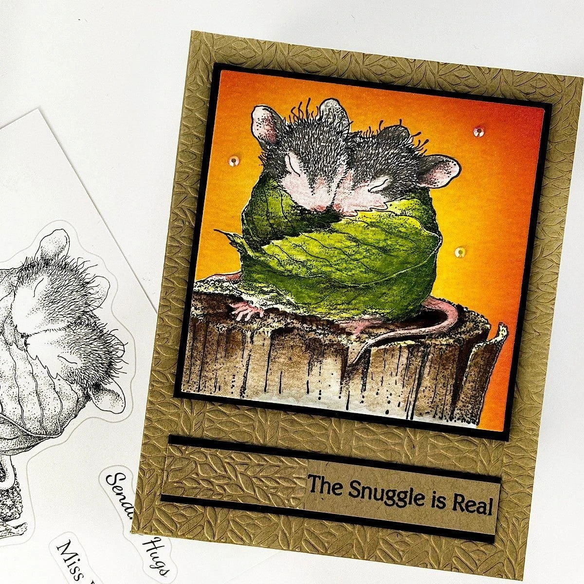 Snuggle Up Cling Rubber Stamp Set is part of the House-Mouse Winter Collection with a set of four stamps. Muzzy and Amanda snuggle in a warm blanket on top of a tree stump. Also included are three sentiments, The Snuggle is Real, Sending Hugs, and Miss You. Designed to be used with an acrylic block.