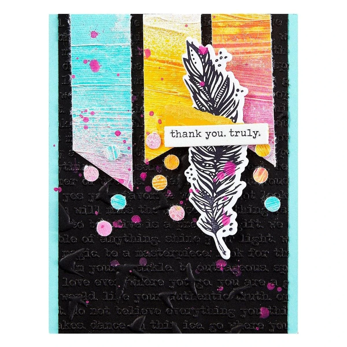 Spellbinders is delighted to collaborate with mixed media artist Dina Wakley! Known for her expressive style and artsy aesthetic, Dina’s designs bring the playfulness and charm of mixed media and collage to cardmakers. Centered around soaring birds and elegant typography, Dina’s first collection with Spellbinders showcases textures with BetterPress plates and embossing folders.