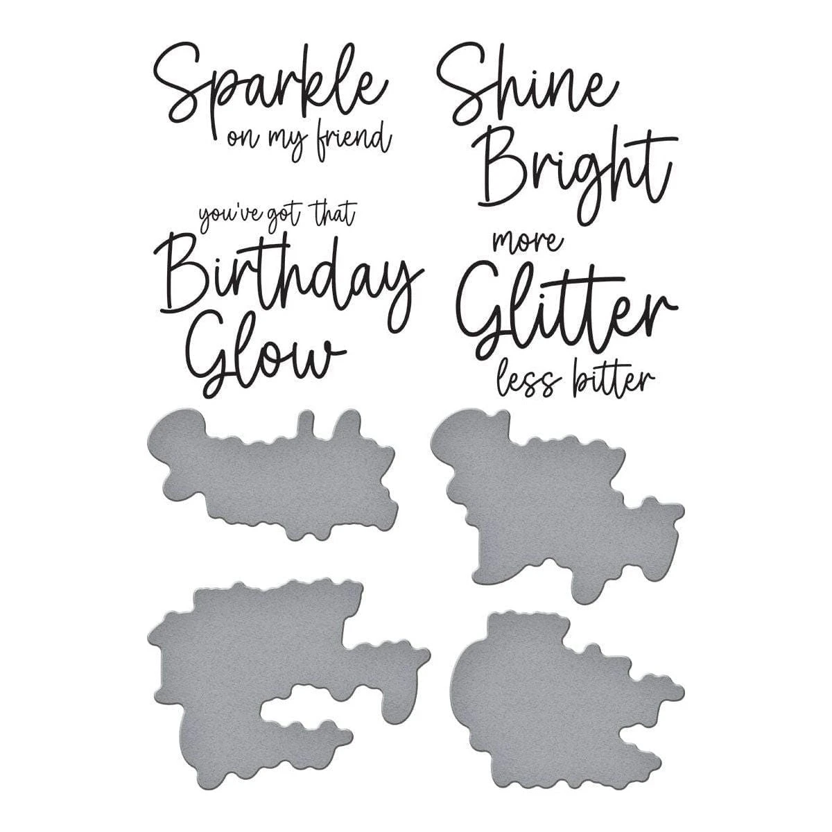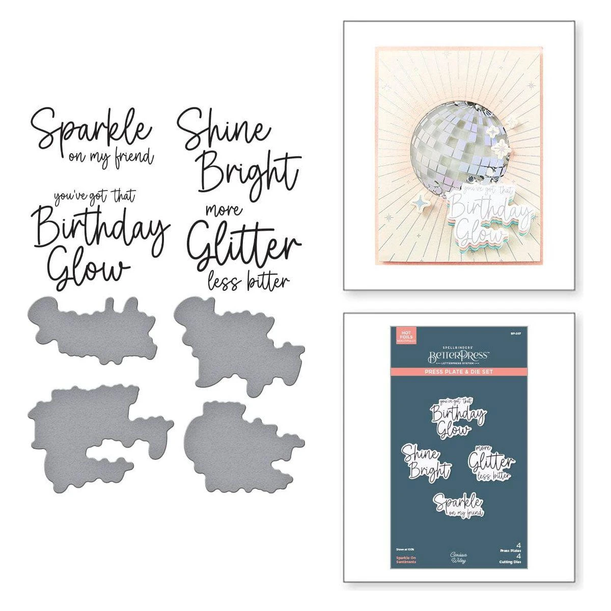 Sparkle On Sentiments Press Plate & Die Set is from the Shine Bright Collection by Carissa Wiley. Add these four fabulous sentiments to your card creations in a slightly larger format with a fun script font. The set of four press plates with its four matching thin metal cutting dies cuts out You’ve Got that Birthday Glow, Sparkle On My Friend, More Glitter Less Bitter and Shine Bright. Ink the plates with the BetterPress Ink to be pressed against the BetterPress Cotton Card Panel and Sheets for a crisp letterpress design.