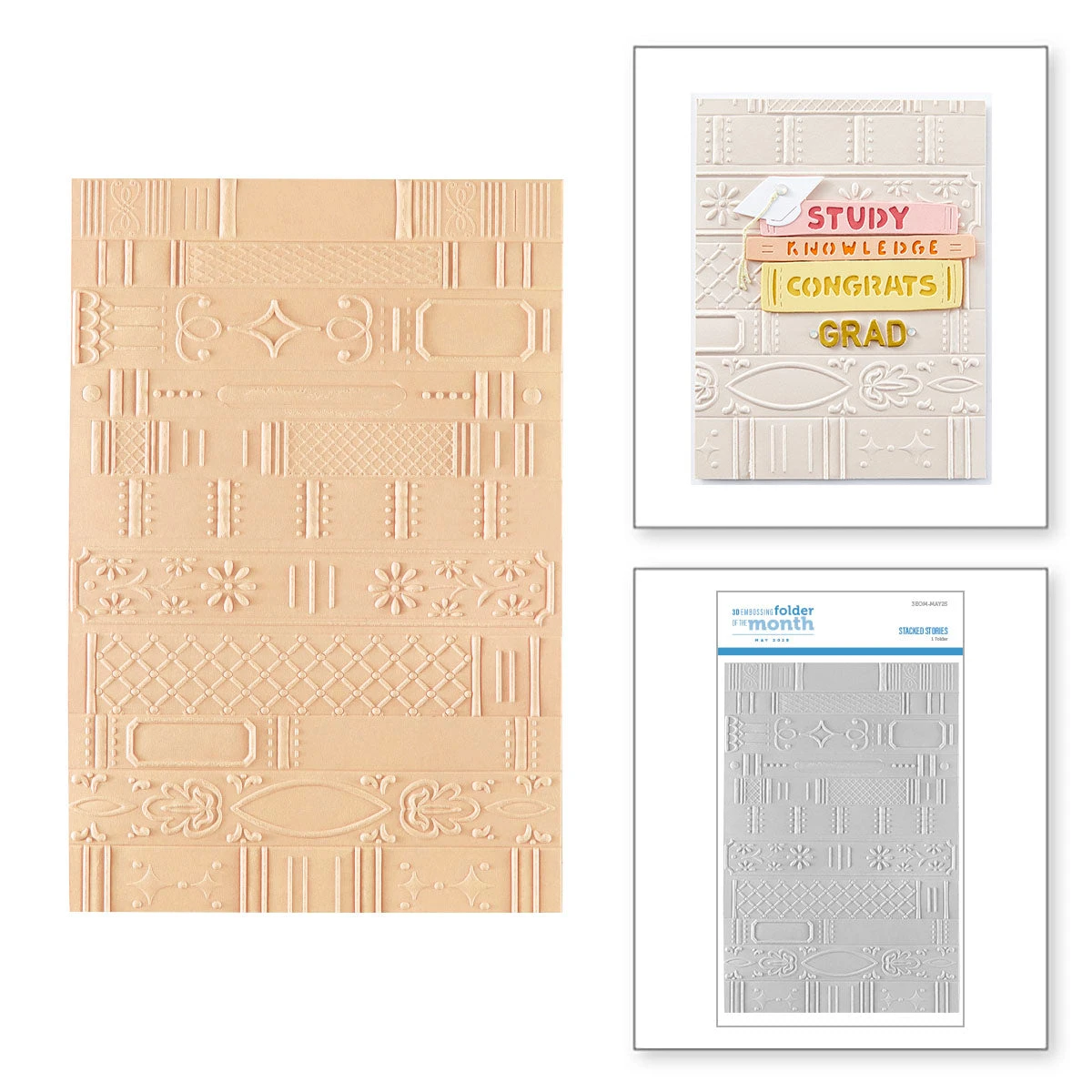 Stacked Stories – 3D Embossing Folder of the Month released May 2025 to our Embossing Folder of the Month Club. This large embossing folder can make slimline, 5.5″ x 8.5″, and a variety of sized projects. Perfect for adding even more texture and dimension to your card projects.