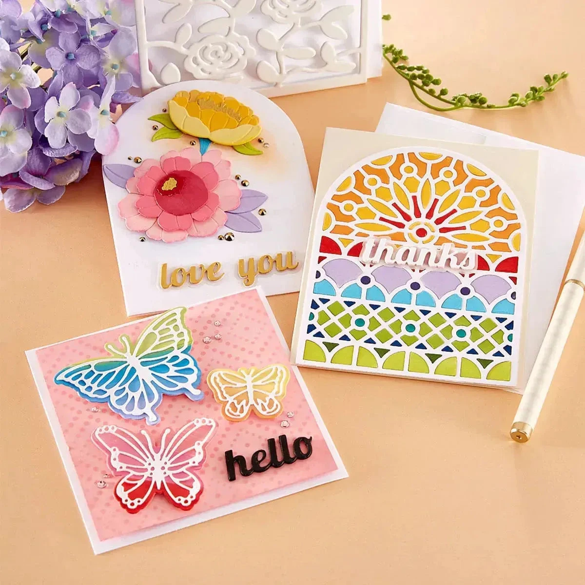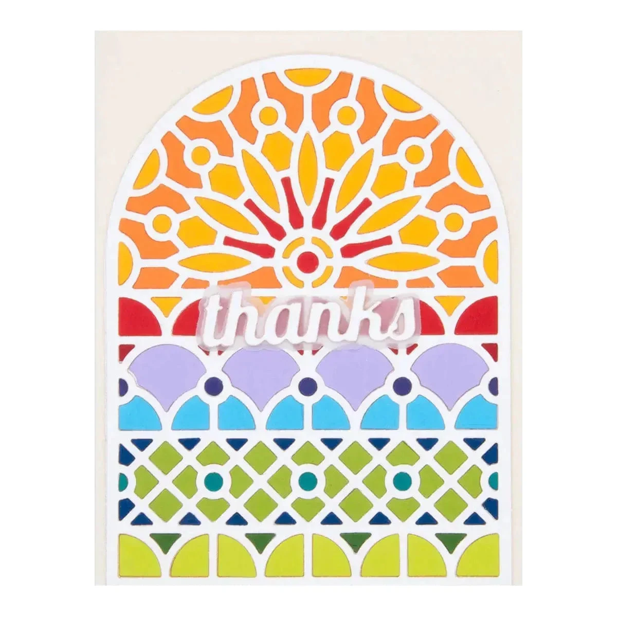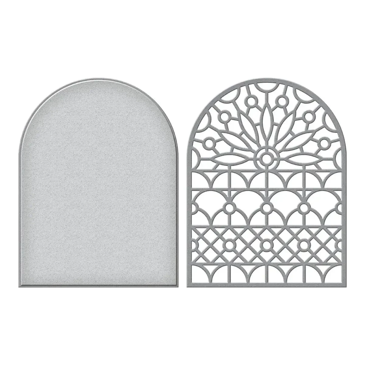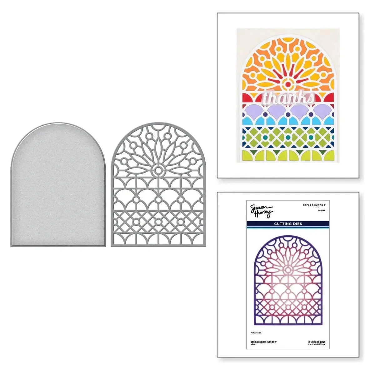 Stained Glass WindowEtched Dies are part of the Metamorphosis Collection by Simon Hurley. The set of two thin metal dies nested together makes a stunning and intricate stained glass window. It is big enough to fit an A2 size card front. Die-cut the window outline with patterned paper and place behind the intricate window for a WoW factor!