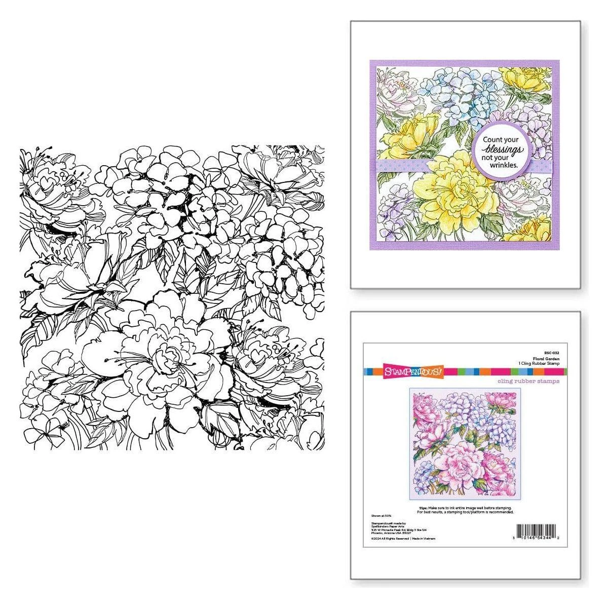 Stampendous Floral Garden Cling Rubber Stamp Set is a stunning floral design covers the entire cling rubber stamp surface. Fun to use watercolors or markers to color the full blooms! Designer’s Tips: Make sure to ink the entire image well before stamping. For best results, a stamping tool/platform is recommended.