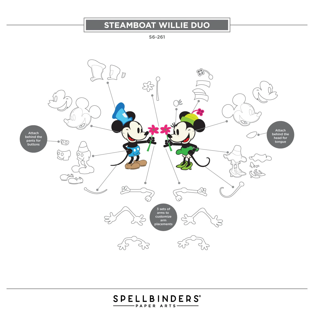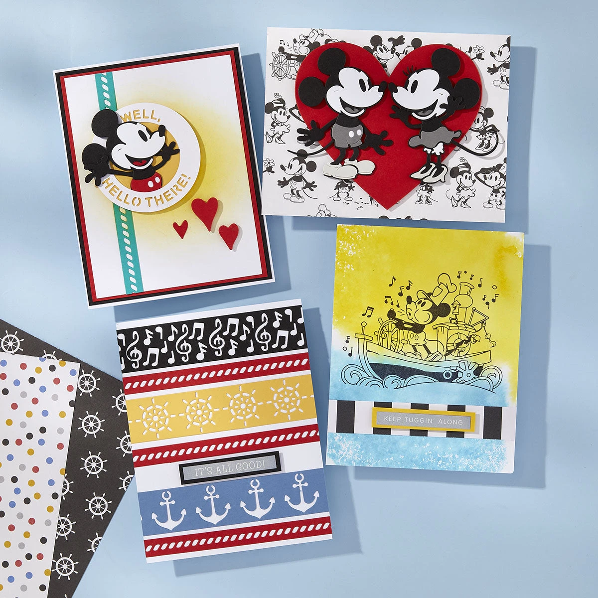 Steamboat Willie Duo Etched Dies are the cornerstone of the Say Cheese Classic Mouse Collection. Create detailed and layered die cuts of your favorite mouse couple. Whether you use all the pieces to give them hats and flowers, or go with a paired down, classic look, this set of 34 dies will have you saying “Golly!” and reaching for more paper! These two sweethearts are designed to face each other, and they have multiple arm options to make sure they’ve got the perfect expression. These cuties are perfect for pairing with the other dies in the collection, especially S4-1470 Frame & Sentiments. This charming (and big!) set is sure to become and instant favorite.