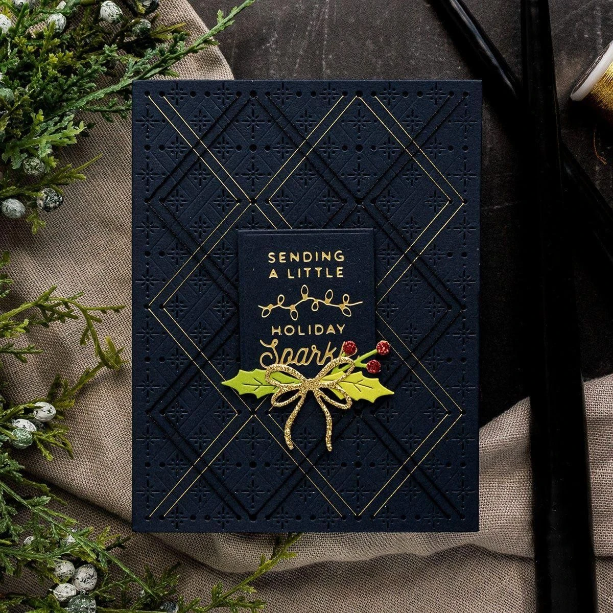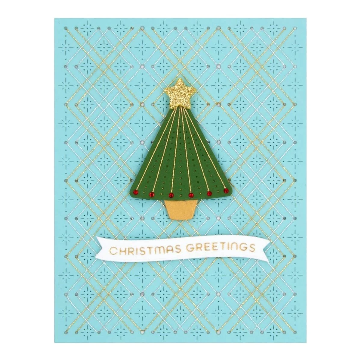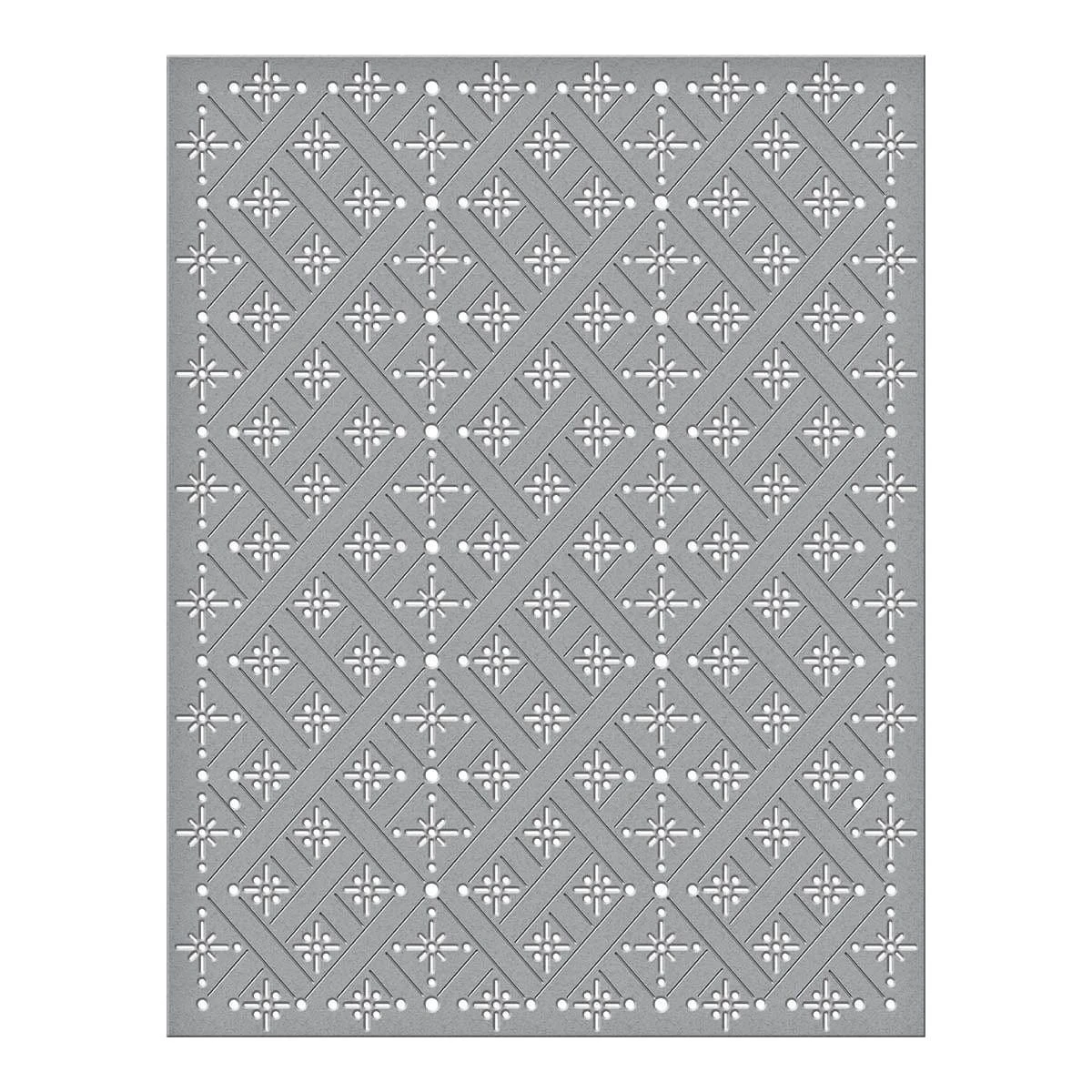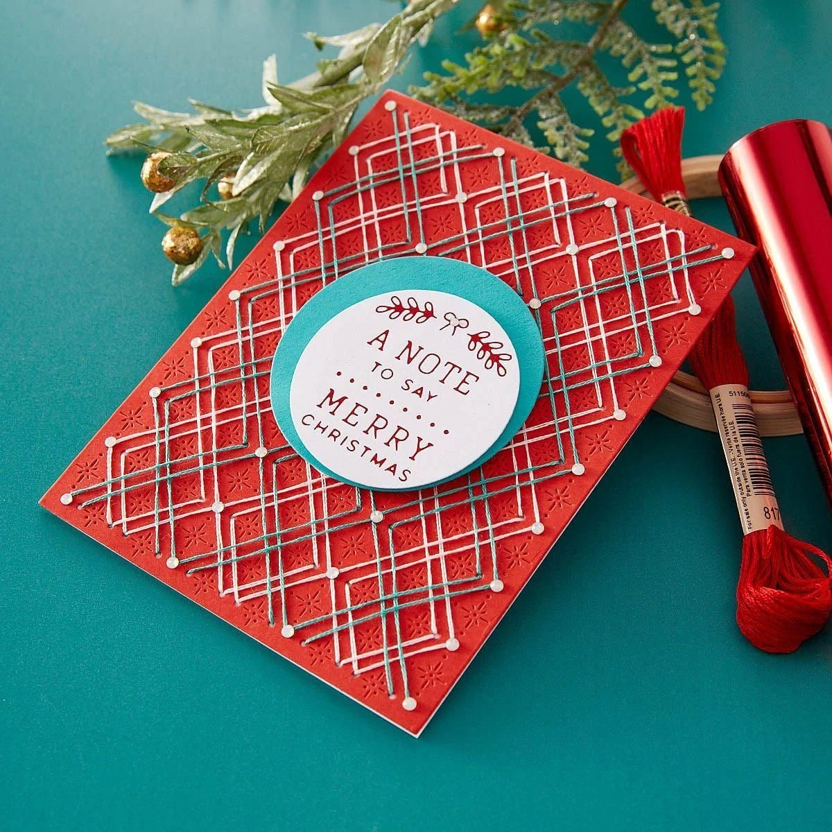 Stitched Starry Argyle Etched Dies are from the Stitched for Christmas Collection by Spellbinders. This thin metal cutting die covers a standard A2 (4.25 x 5.5 inch) size card front. When cut, it creates a wonderful argyle design with stars in between the threads when stitched. Truly a magical backdrop! Designer’s Tip: Using two strands of a six strand DMC Floss or DMC Diamant Metallic Thread and a Size 22 Tapestry Needle (sold separately) are recommended.