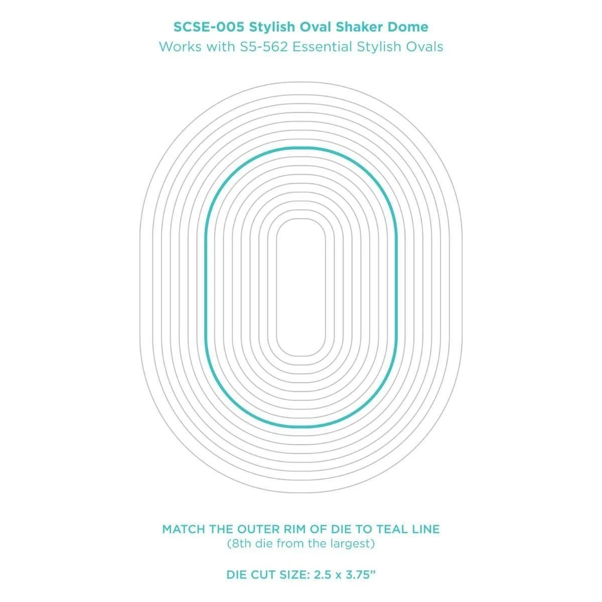 Stylish Oval Shaker Dome comes in a pack of six clear shaker domes. The raised area measures 0.38 inches so you can fill it with chunky glitter, shaker mixes and more for a wonderful interactive project! Add to your card, scrapbook layout, home décor and beyond. Works well with S5-562 Essential Stylish Ovals Etched Dies to die-cut patterned paper, stamped images or even a photo to add to the inside.