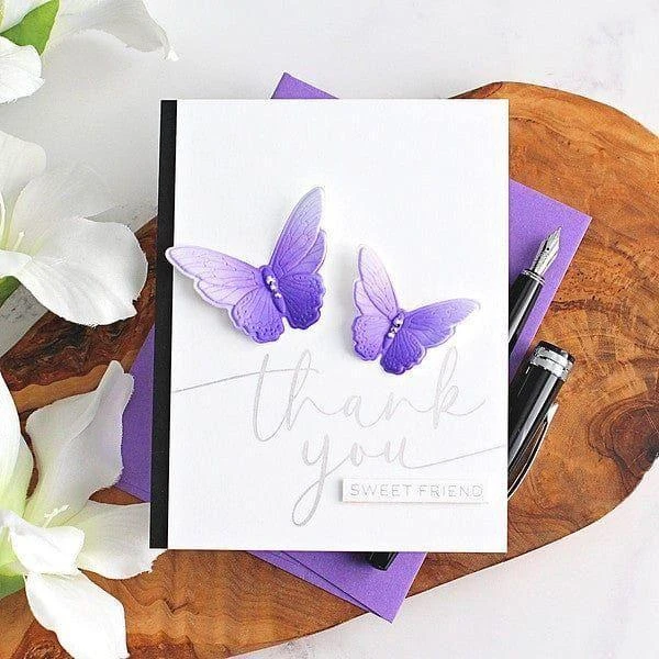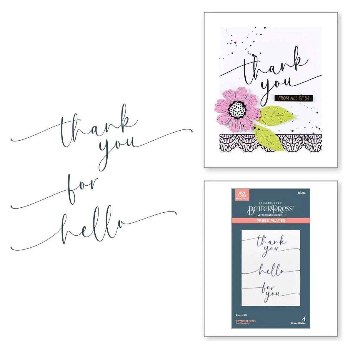 Sweeping Script Sentiments Press Plates are from the Vivid Expressions Collection. Add beautiful sweeping script font to your projects! The set of four plates includes thank, hello, for and you. Ink the plates with the BetterPress Ink to be pressed against the BetterPress Cotton Card Panel and Sheets for a crisp letterpress design.