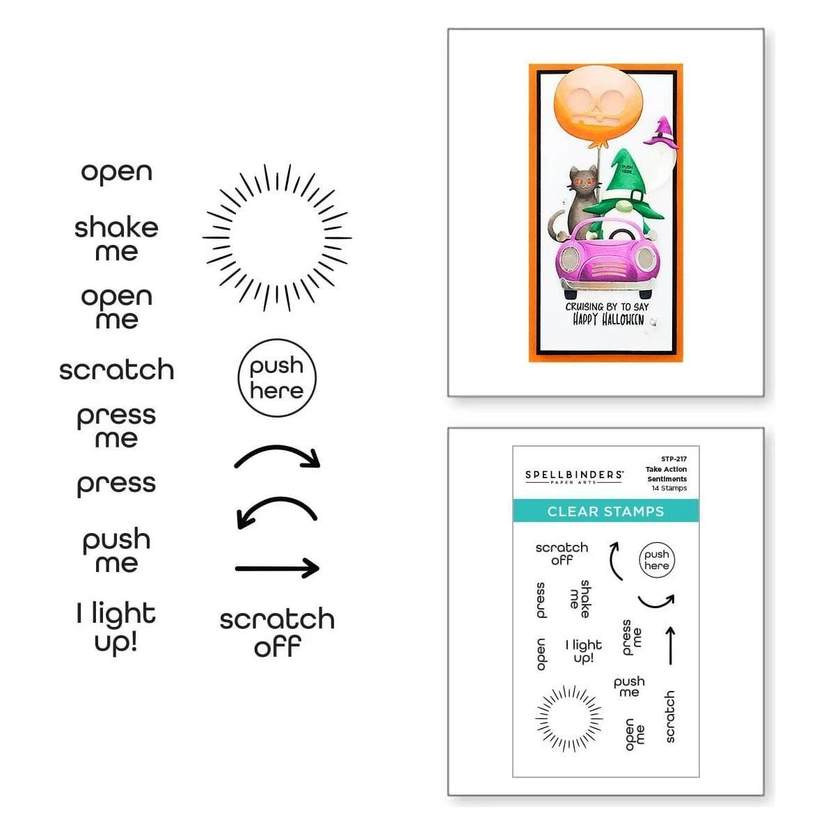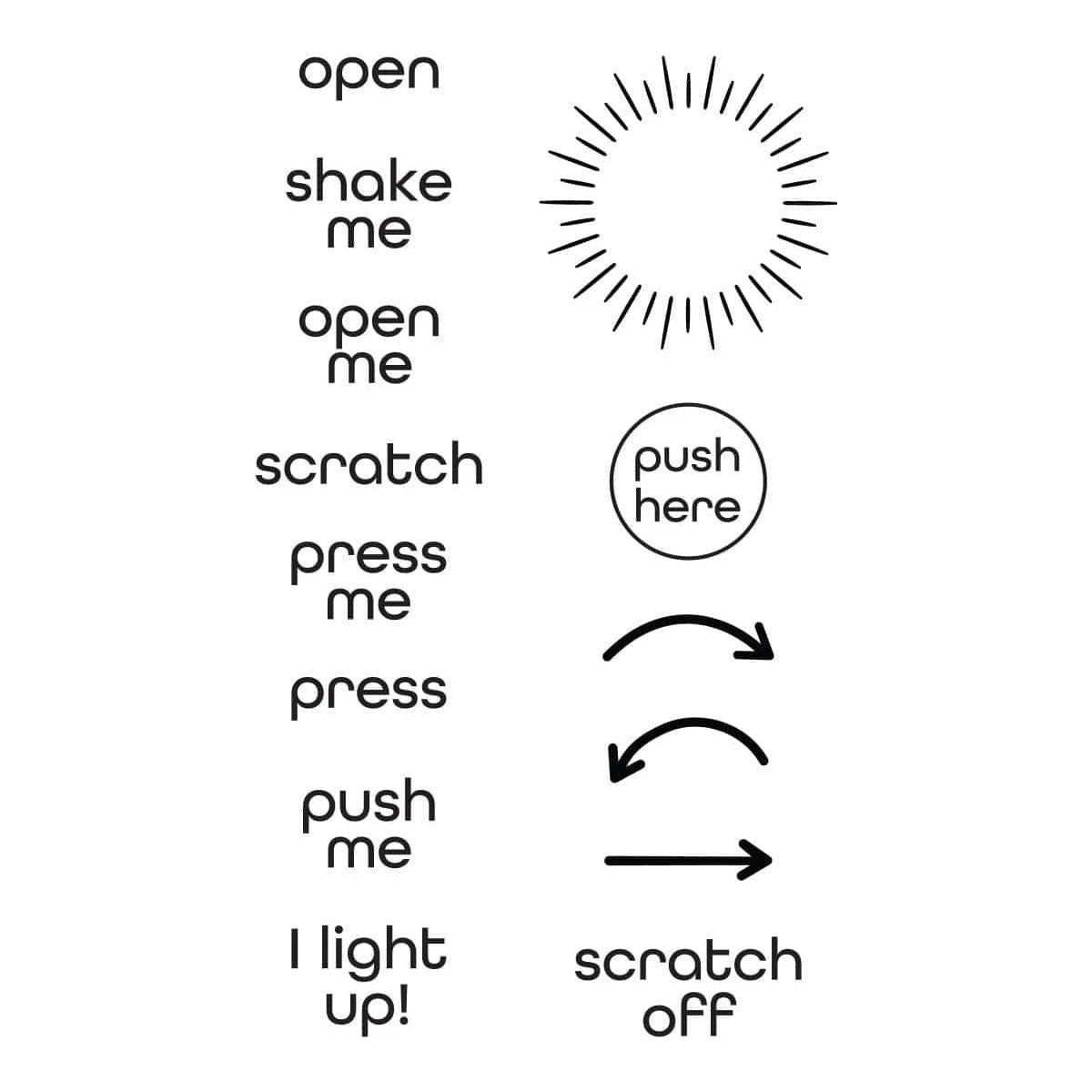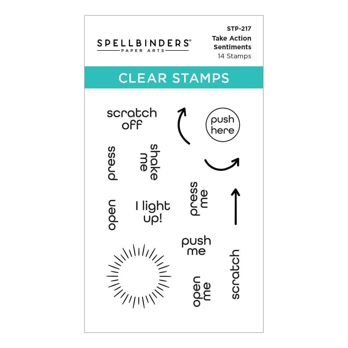 Take Action Sentiments Clear Stamp Set is a set of 14 stamps designed to be used with interactive card elements. With stamps for “Push me,” “Shake Me,” “Open Me” and “Scratch Me,” you’ll be able to easily gift playful cards and projects with easy instructions. Also included are arrows and circles to let your recipients know where to press for lights and more.