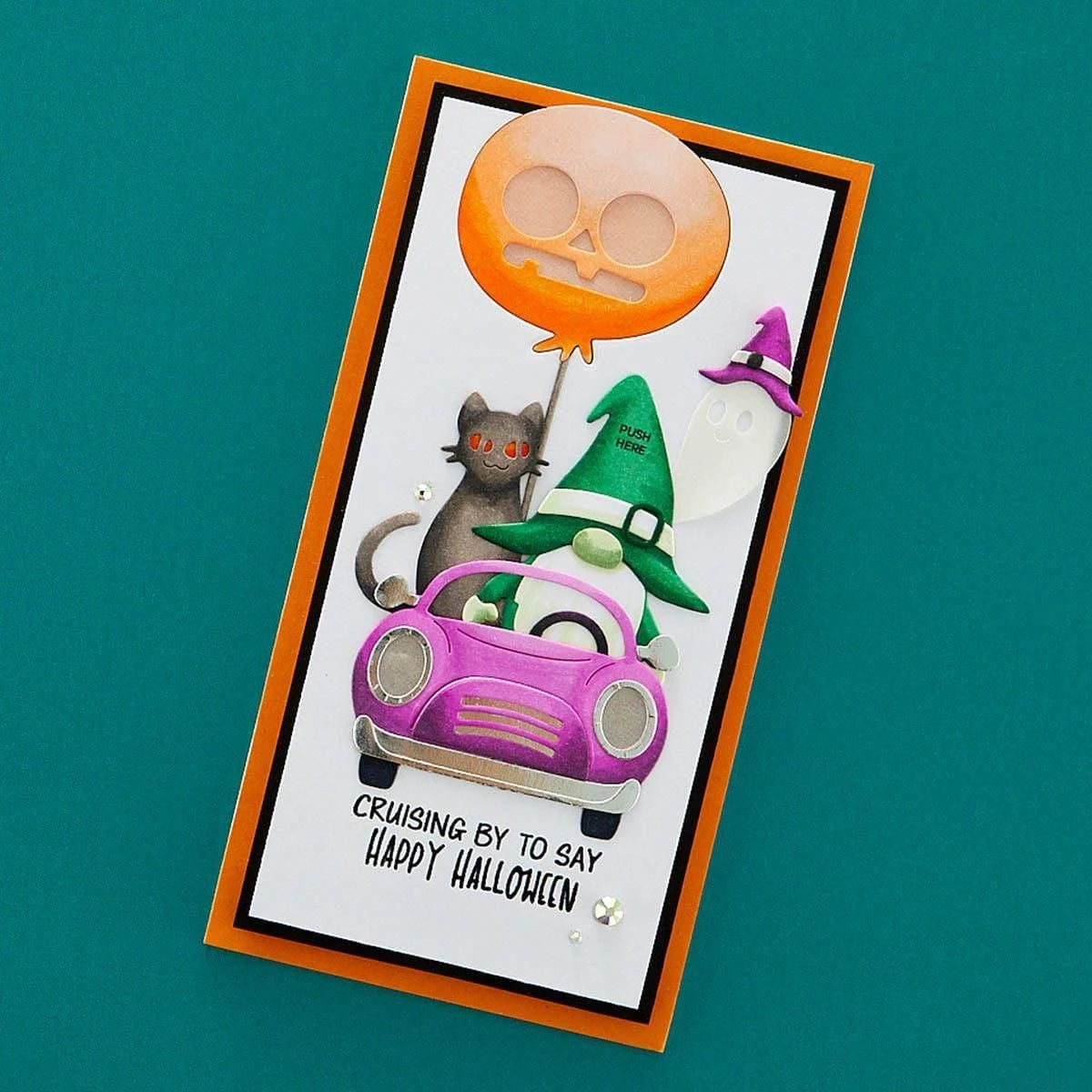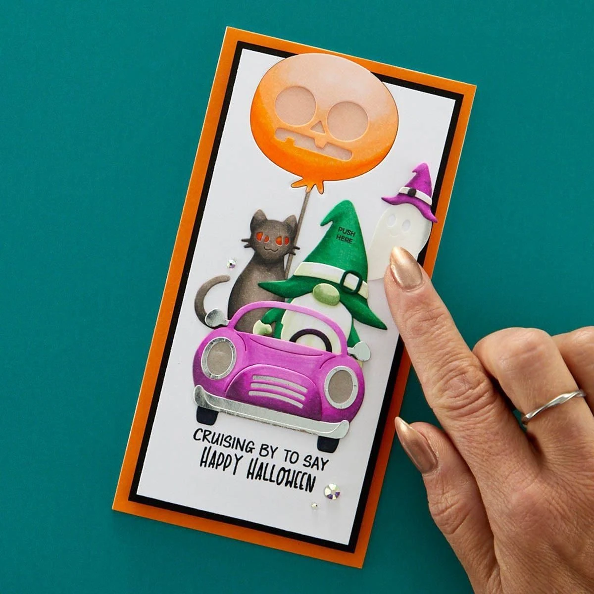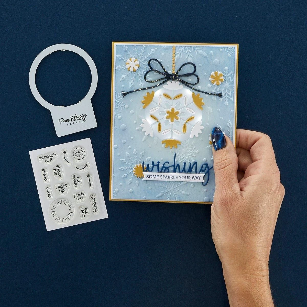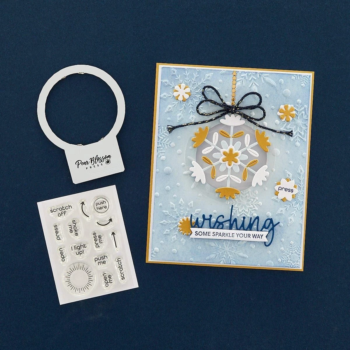 Take Action Sentiments Clear Stamp Set is a set of 14 stamps designed to be used with interactive card elements. With stamps for “Push me,” “Shake Me,” “Open Me” and “Scratch Me,” you’ll be able to easily gift playful cards and projects with easy instructions. Also included are arrows and circles to let your recipients know where to press for lights and more.