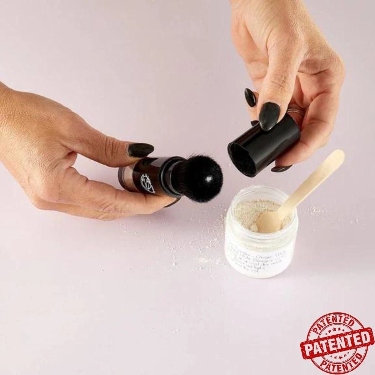 - Cleanable design – simply empty the reservoir and tap the uncapped brush to remove excess powder. Use a damp terry towel with a few drops of rubbing alcohol to clean the brush head. Allow it to air dry overnight, then brush it on a dry towel, refill with your preferred powder, and it’s ready to use.